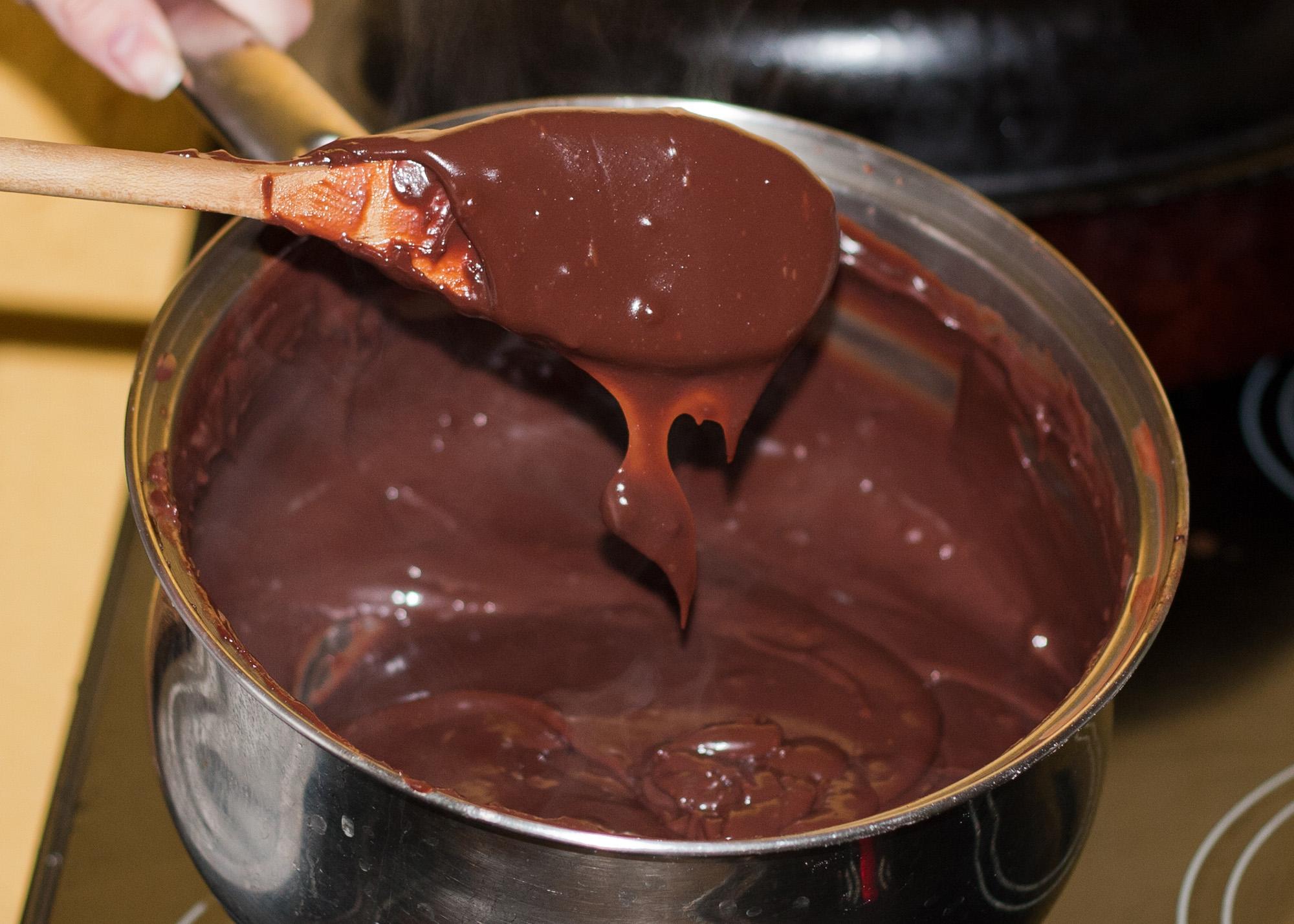 Para finalizar este bolo de festa delicioso prepare a ganache de chocolate: leve ao fogo uma panela com o leite condensado, o cacau ou chocolate em pó peneirados e a manteiga. Fique mexendo até ficar em ponto de brigadeiro mole, adicione o creme de leite, misture e desligue.