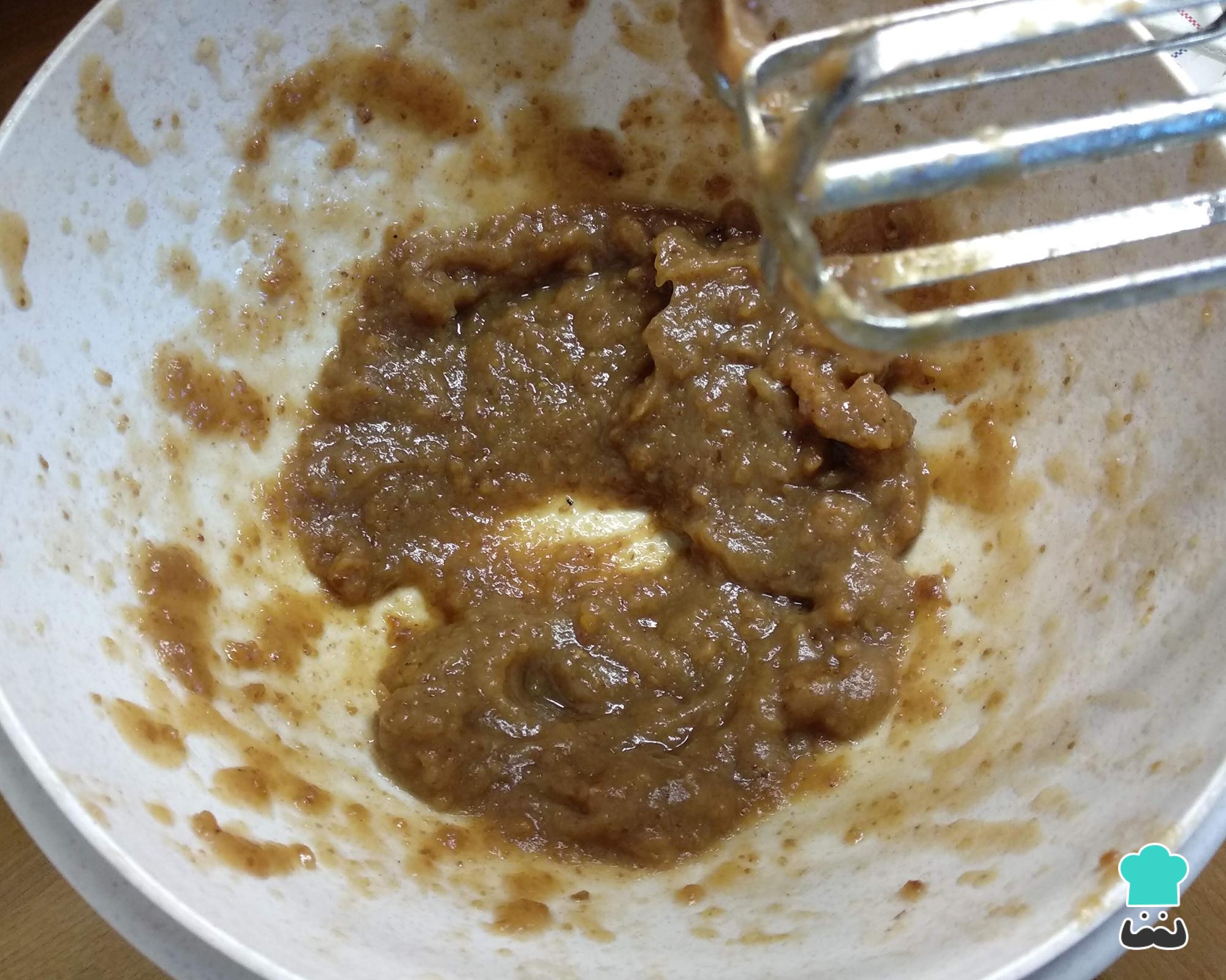 Comece por hidratar a pasta de tâmara ou as tâmaras na água fervente por 5 minutos. Depois processe no liquidificador, processador de alimentos ou simplesmente bata na batedeira junto com o ovo e o óleo.