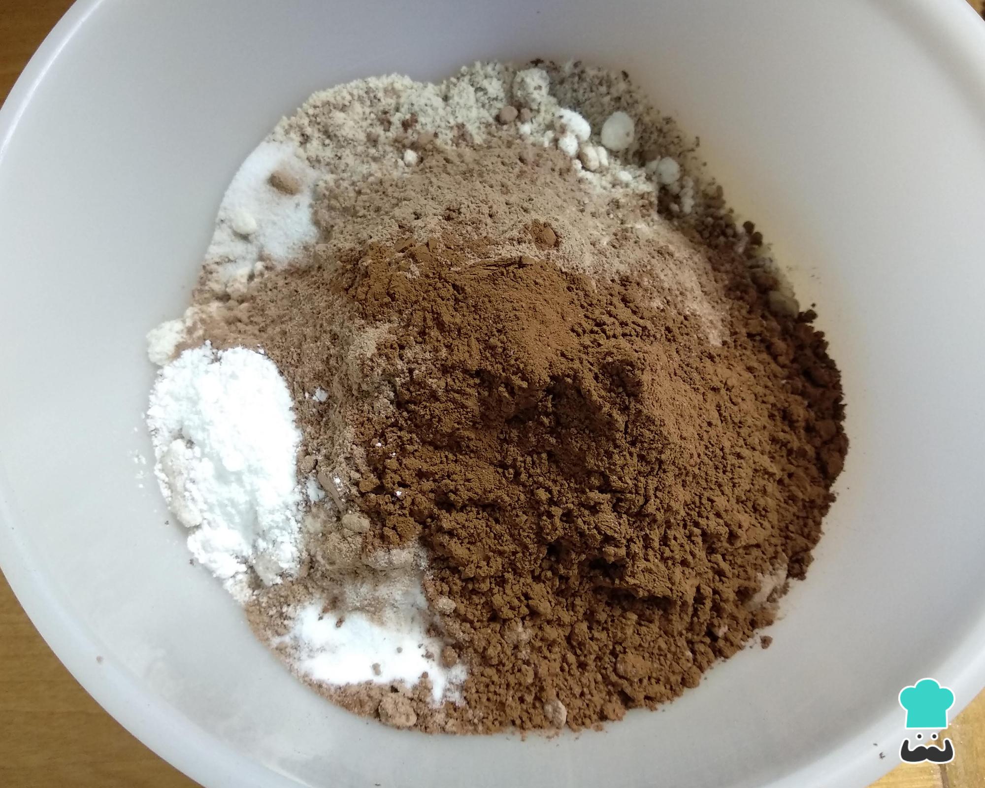Numa tigela à parte misture os ingredientes secos: as farinhas, o cacau, o fermento, o bicarbonato e o sal. Peneire e misture com a massa do bolo de chocolate com tâmaras até incorporar totalmente e virar uma massa pastosa.