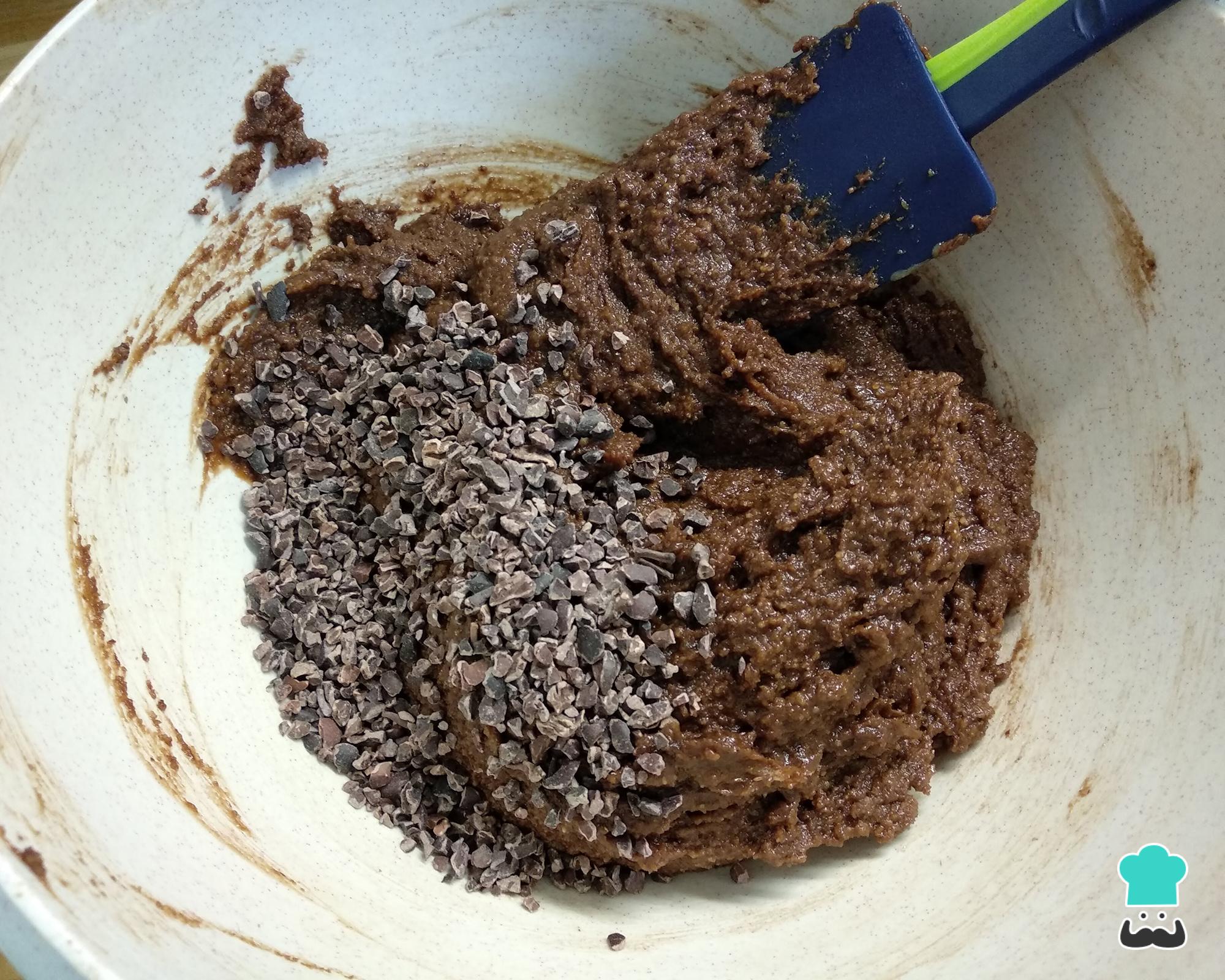 Por fim, se quiser deixar o bolo mais gostoso e com uma textura extra, adicione os nibs de cacau ou gotas de chocolate amargo (se você for intolerante à lactose, confira que as gotas de chocolate não contêm leite).