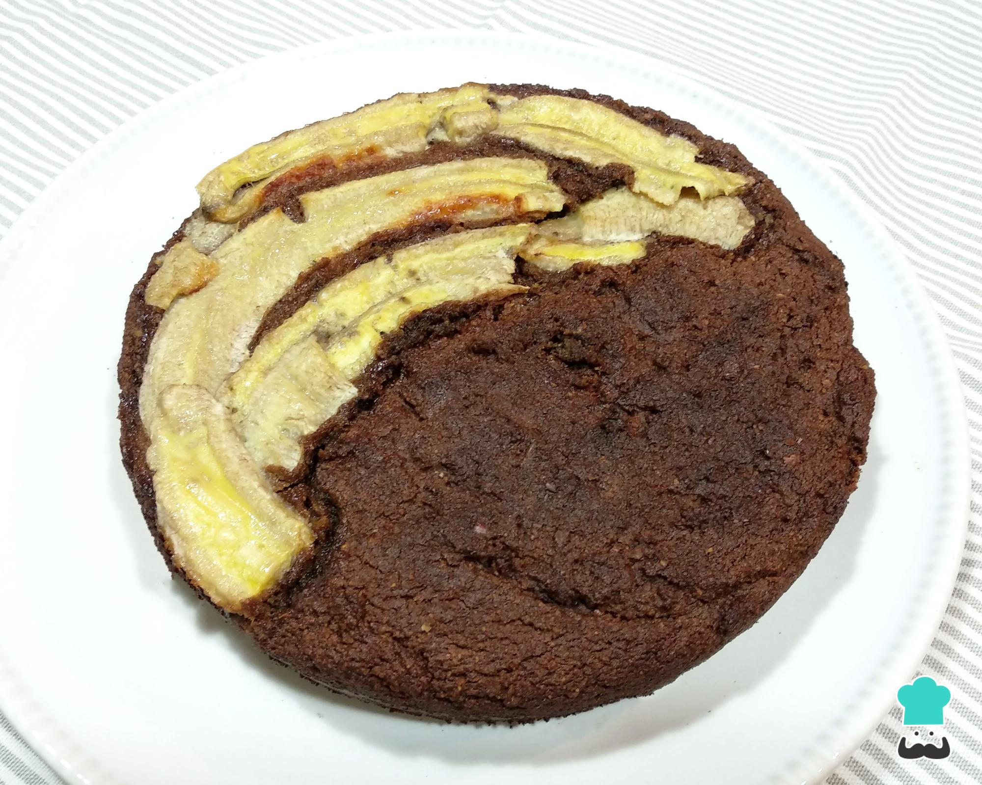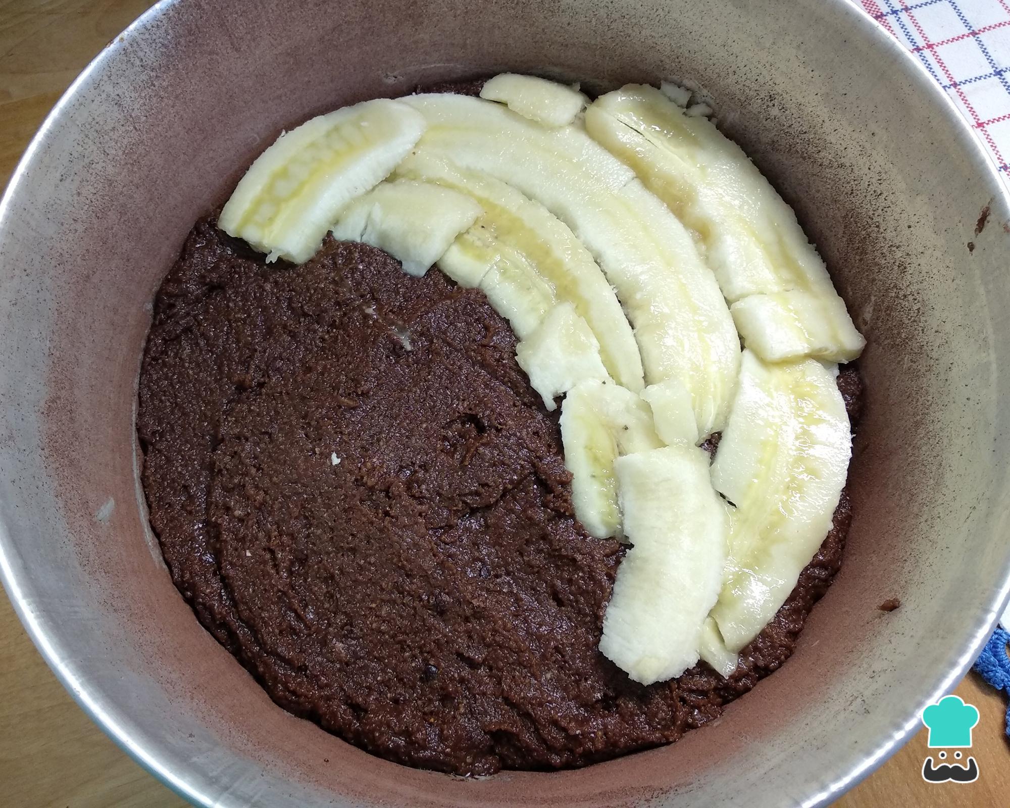 Unte com óleo e polvilhe cacau numa forma de bolo pequena (com 15-20 cm de diâmetro). Coloque nela a massa deste bolo sem açúcar e alise com uma espátula. Nesse momento, se você quiser, pode acrescentar fruta a gosto (eu usei uma banana que já estava bem madura).