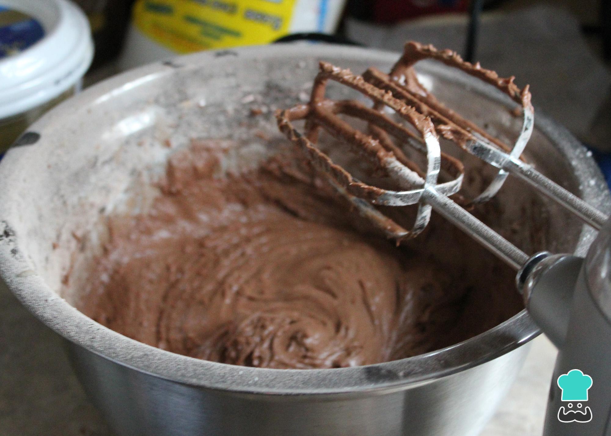 Numa tigela à parte misture os ingredientes secos: o chocolate em pó, o cacau em pó e a farinha de trigo. Peneire e adicione pouco a pouco ao creme anterior, alternando com a água, enquanto bate.
