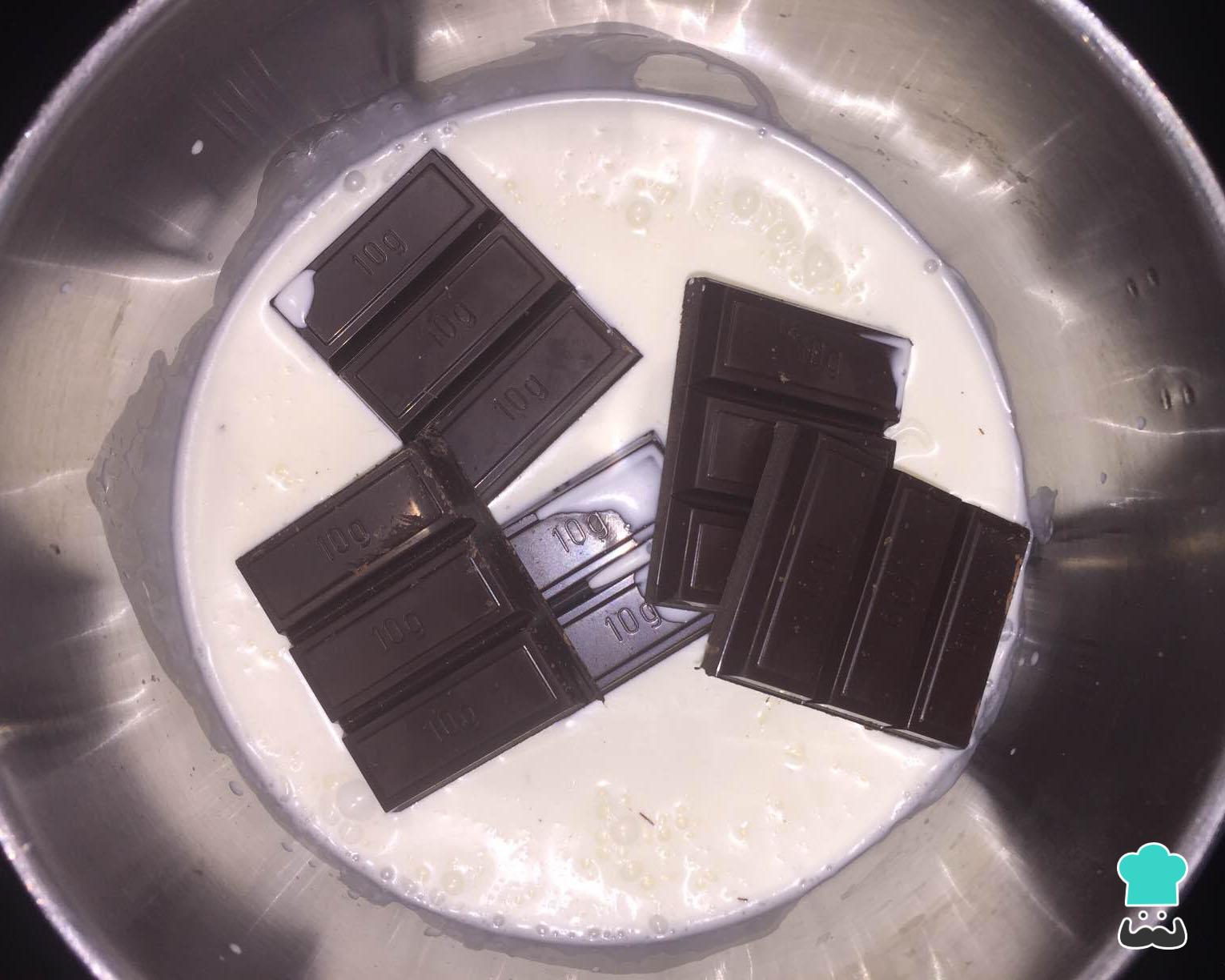 Para fazer a cobertura coloque em uma panela o chocolate e o creme de leite. Leve ao fogo baixo e fique mexendo até o chocolate derreter completamente, sem deixar o creme de leite ferver. Desligue e deixe esfriar um pouco.