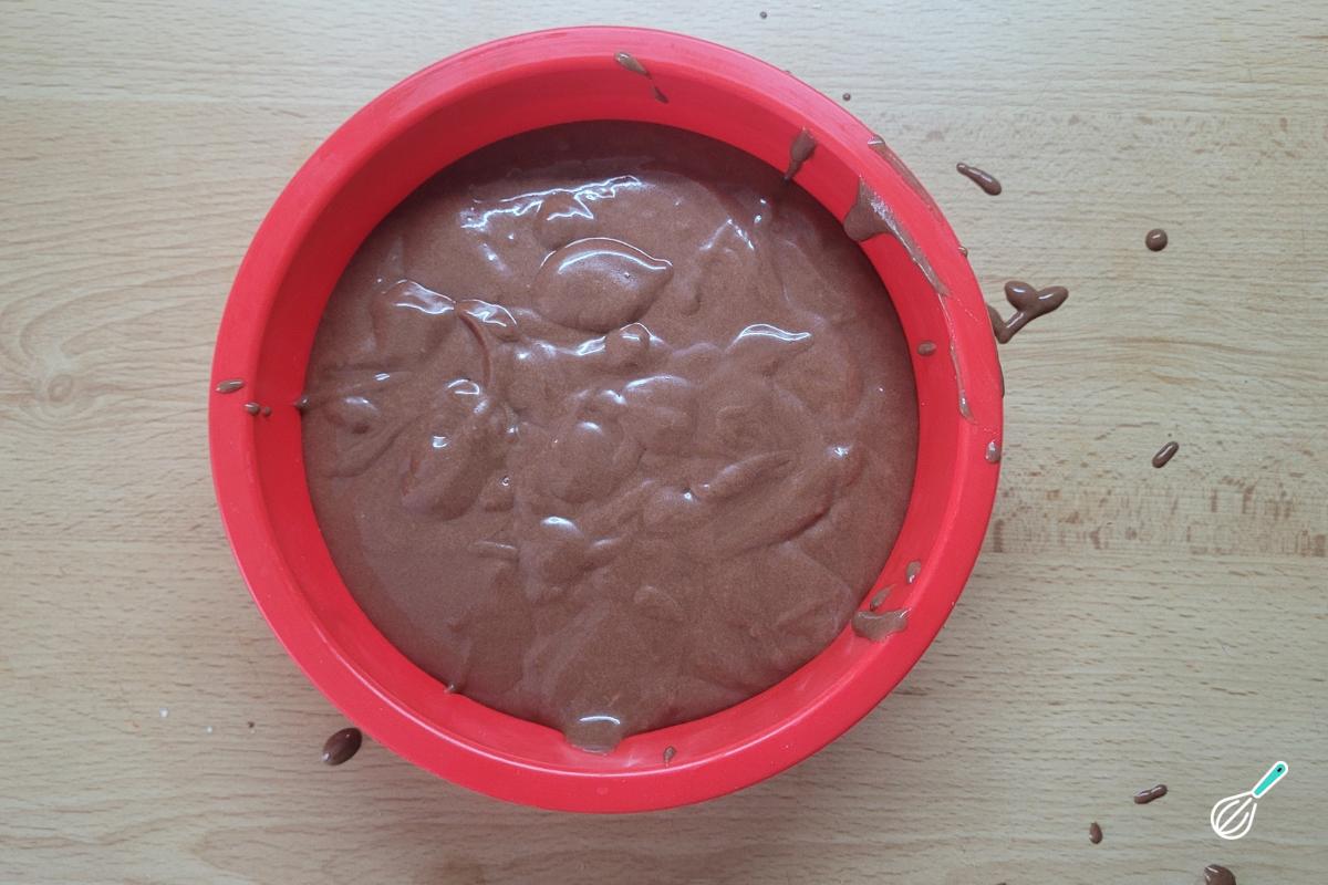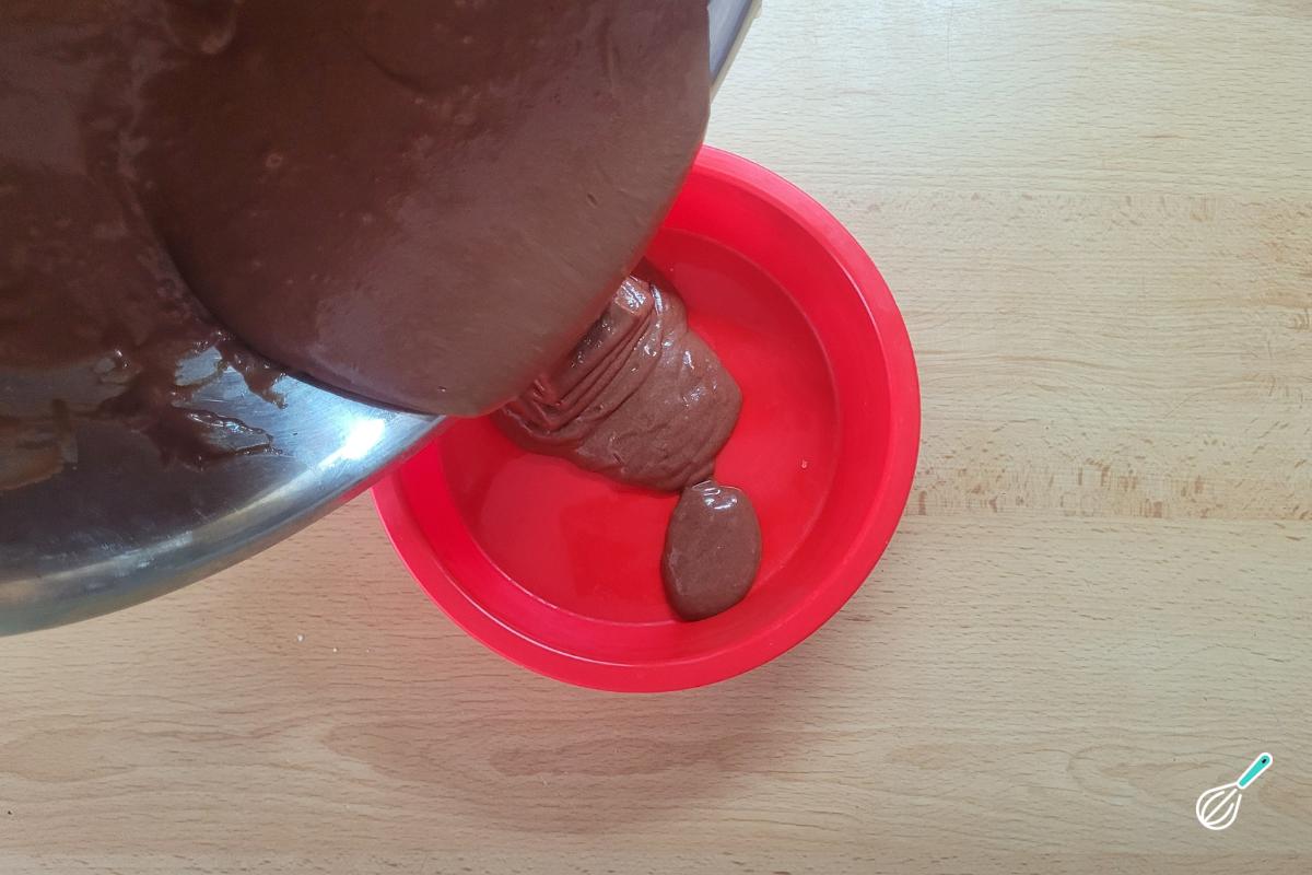 Transfira a massa para a forma já untada. Aqui usei uma forma pequena de silicone que não precisa untar.