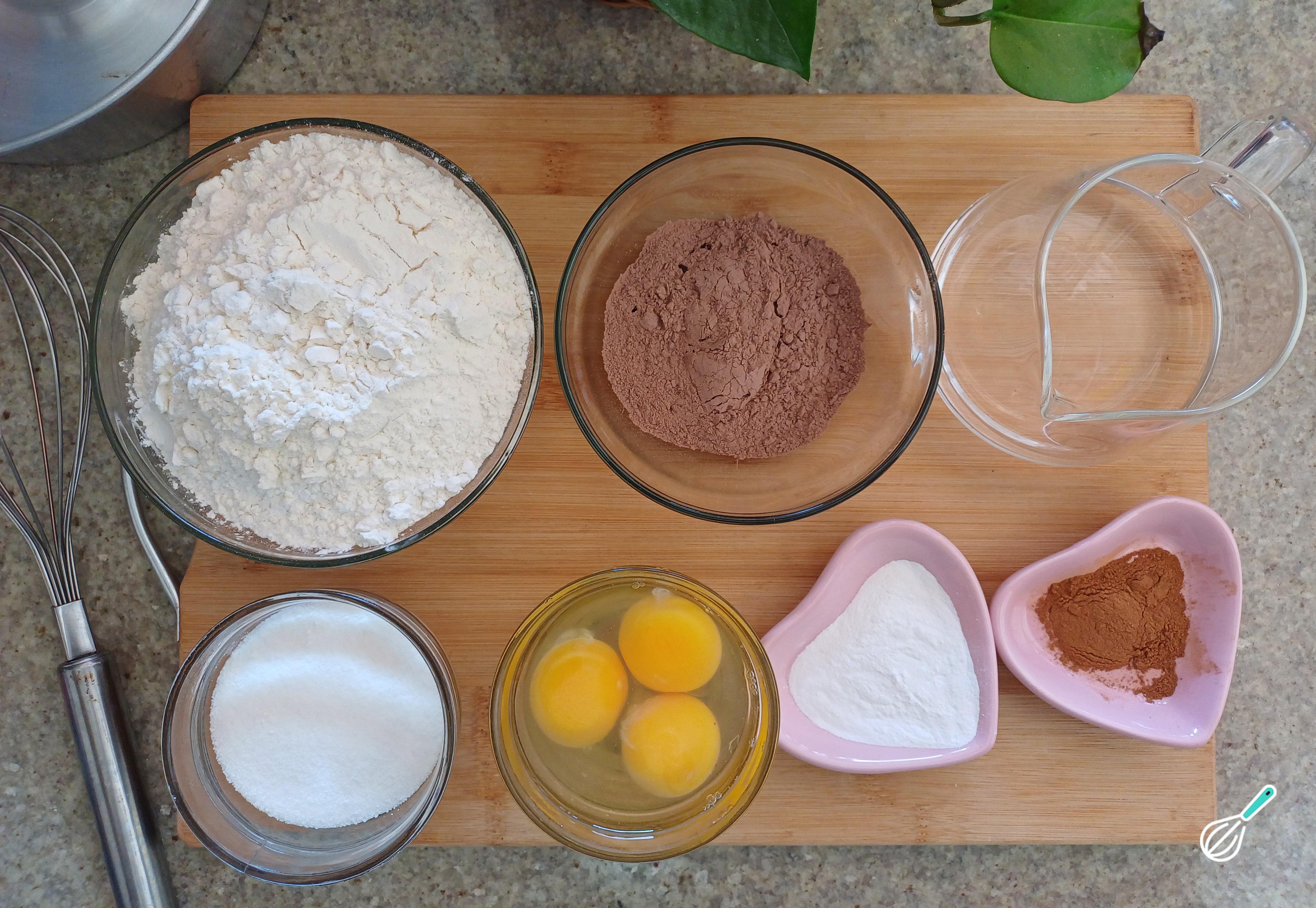 Reúna os ingredientes necessários para o preparo do bolo de chocolate para diabéticos.