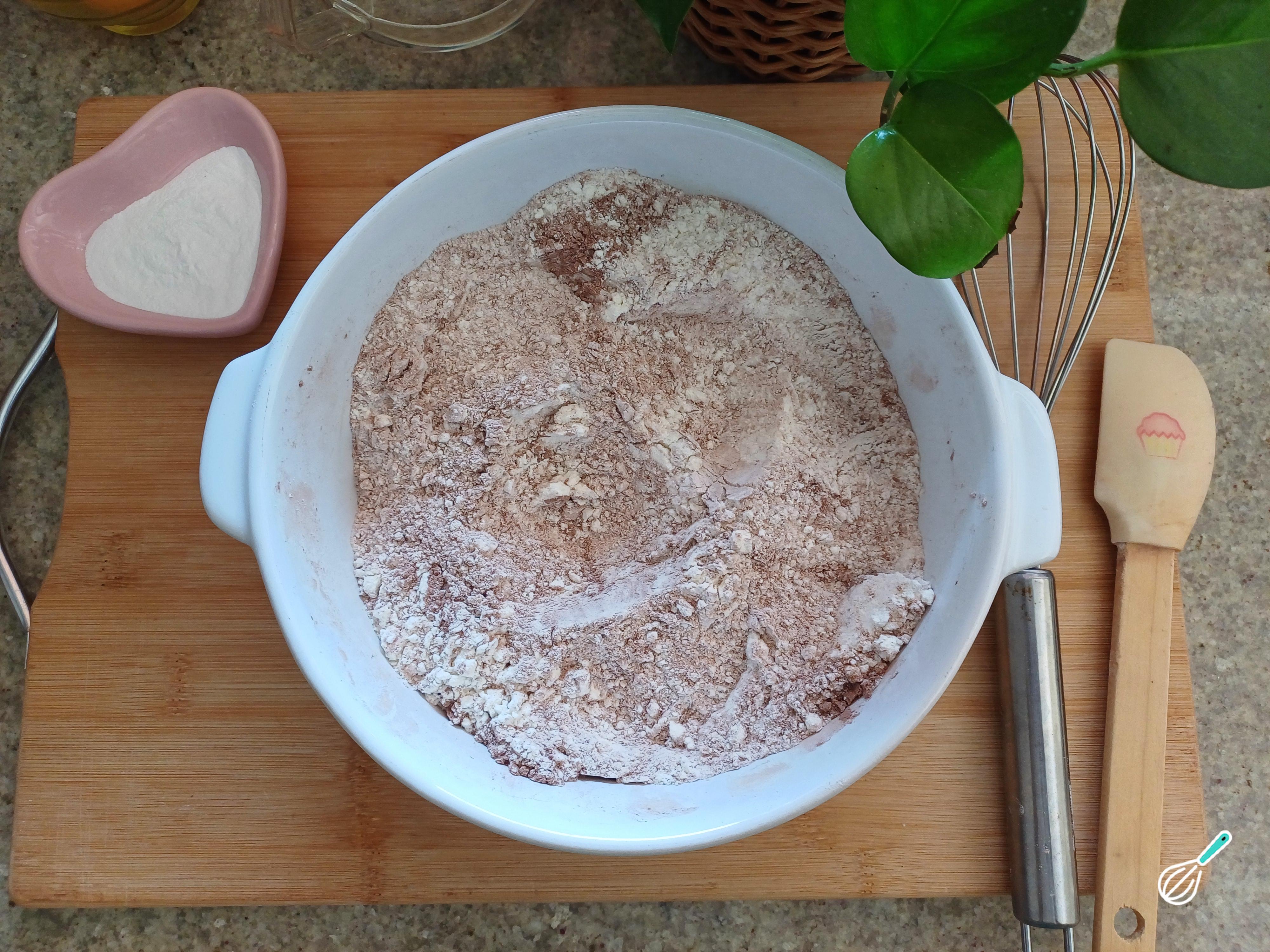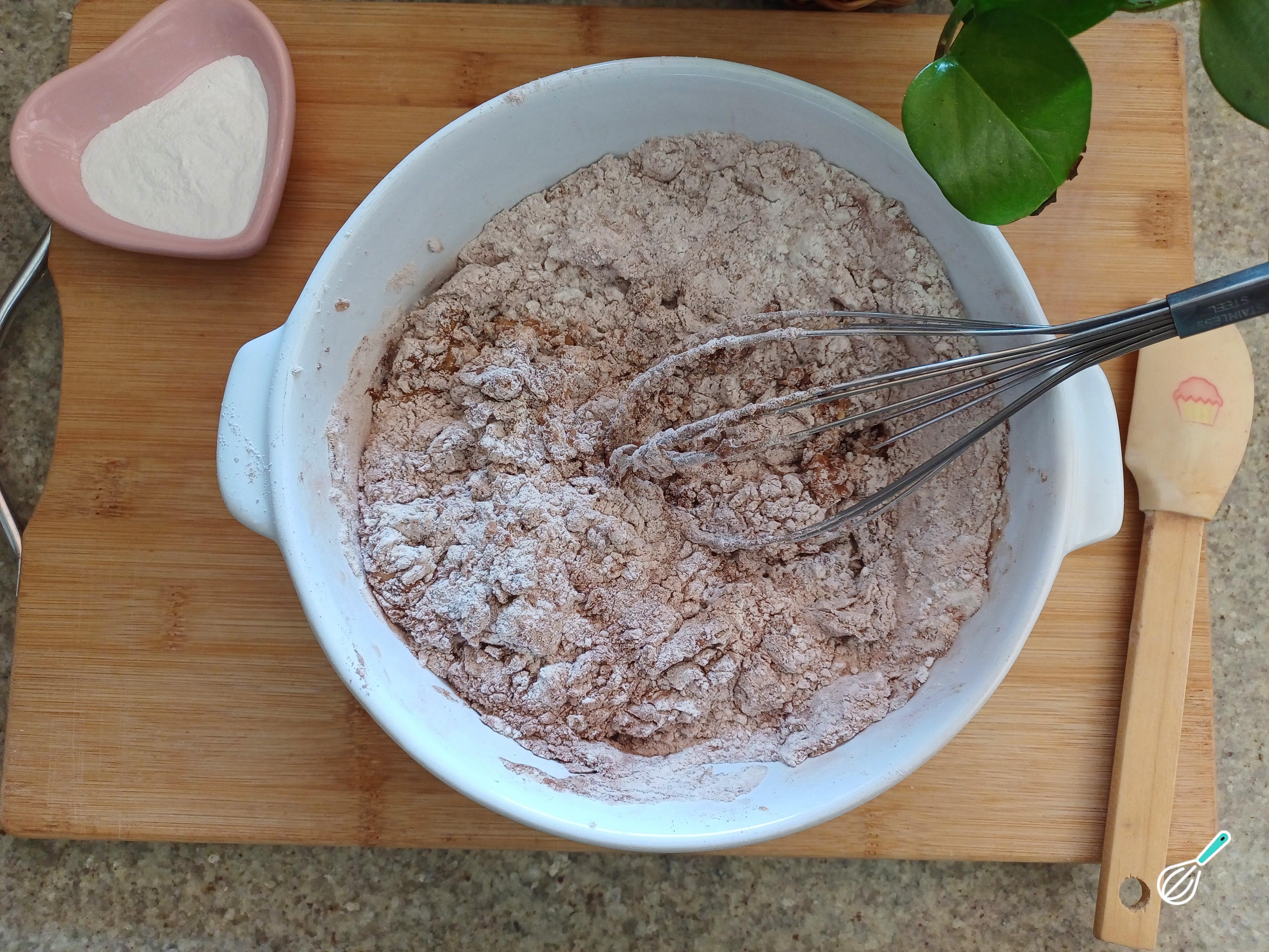 Misture os ingredientes secos: em uma tigela grande, adicione a farinha de aveia, o cacau em pó, o adoçante e a canela em pó. Misture bem para incorporar os ingredientes.