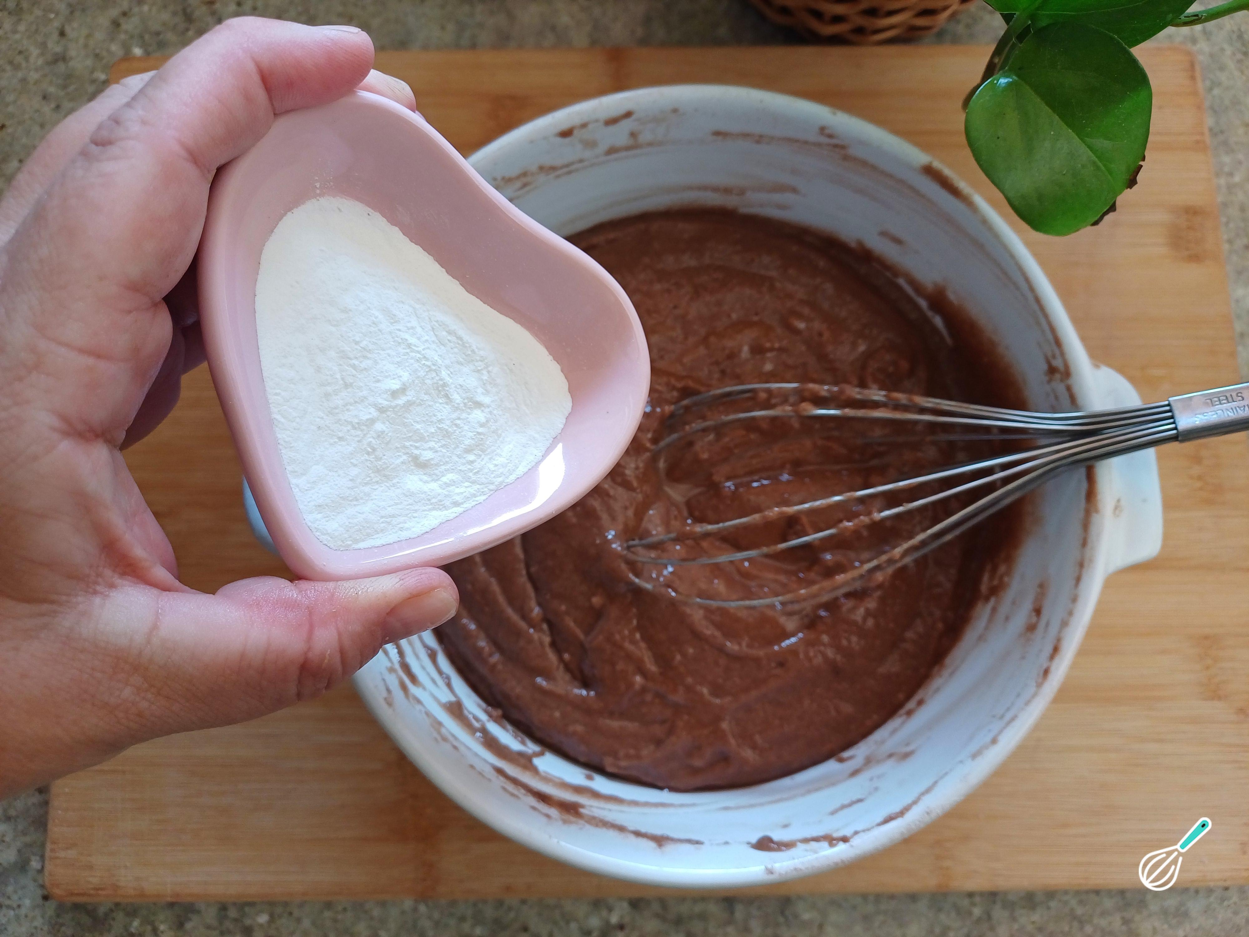 Acrescente o fermento em pó e misture delicadamente, apenas para incorporá-lo à massa.