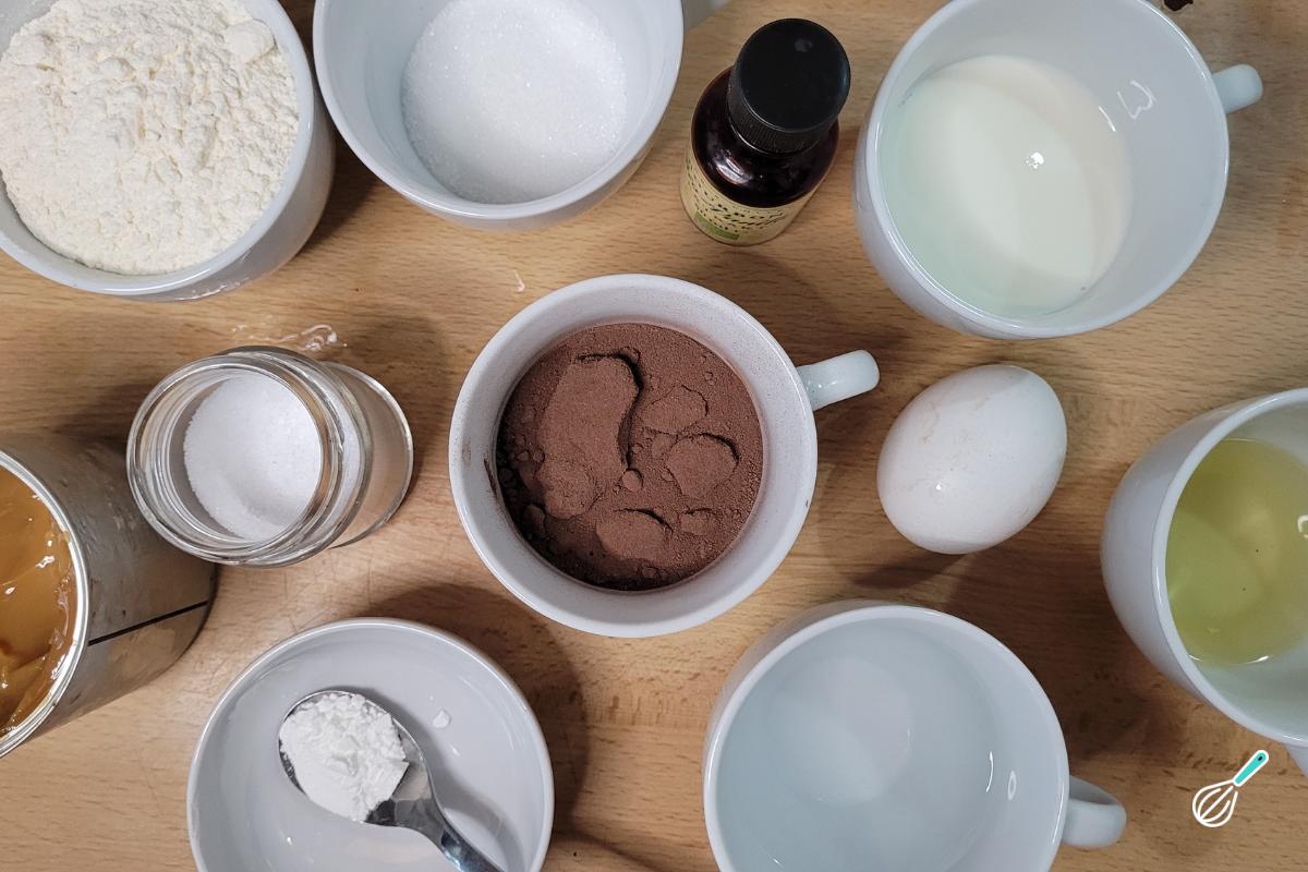 Separe os ingredientes para fazer seu bolo de chocolate que já sai recheado. Aqui fiz uma quantidade para uma forma pequena, mas você pode facilmente aumentar as quantidades para fazer em uma forma maior ou até mesmo dividir em forminhas de muffin ou cupcake para fazer porções individuais.