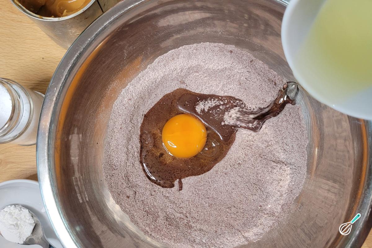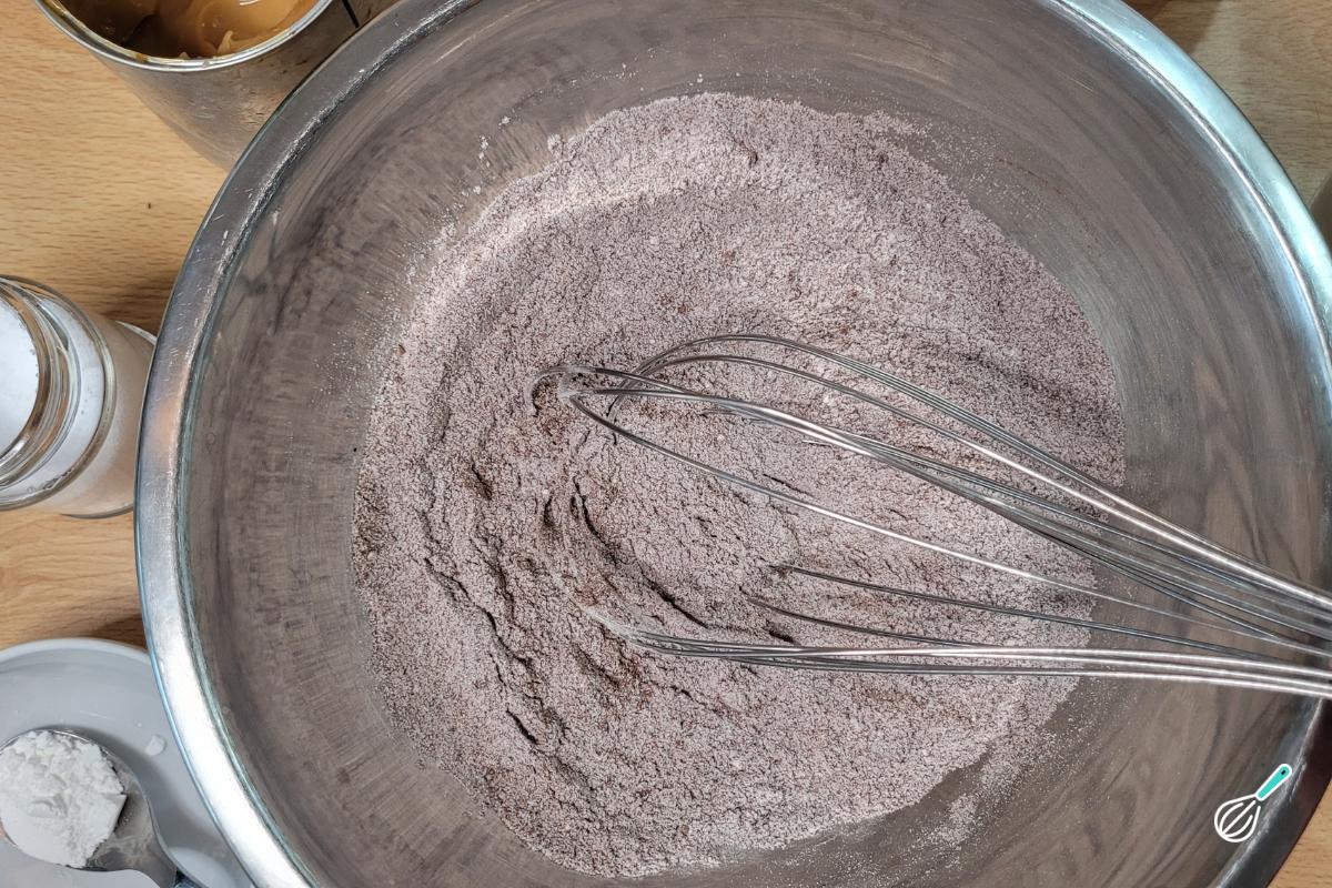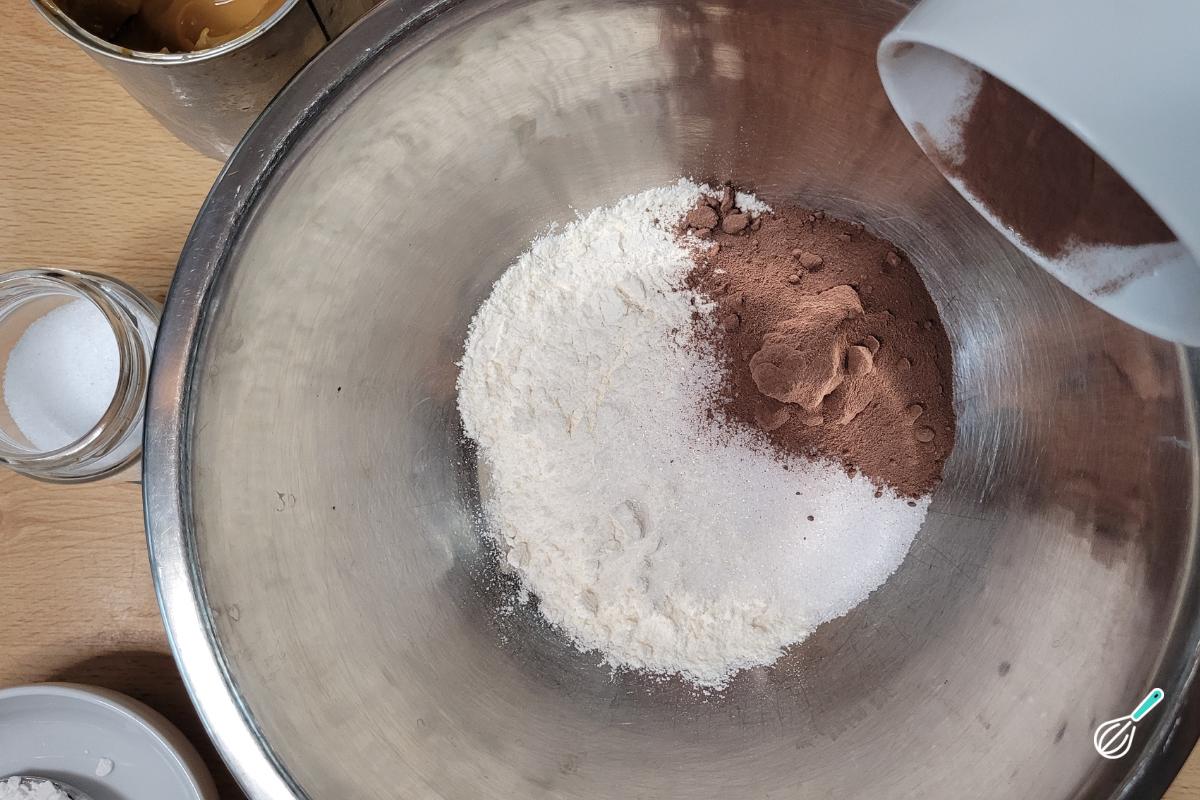 Em uma tigela, misture a farinha, o cacau em pó, o sal e o açúcar.
