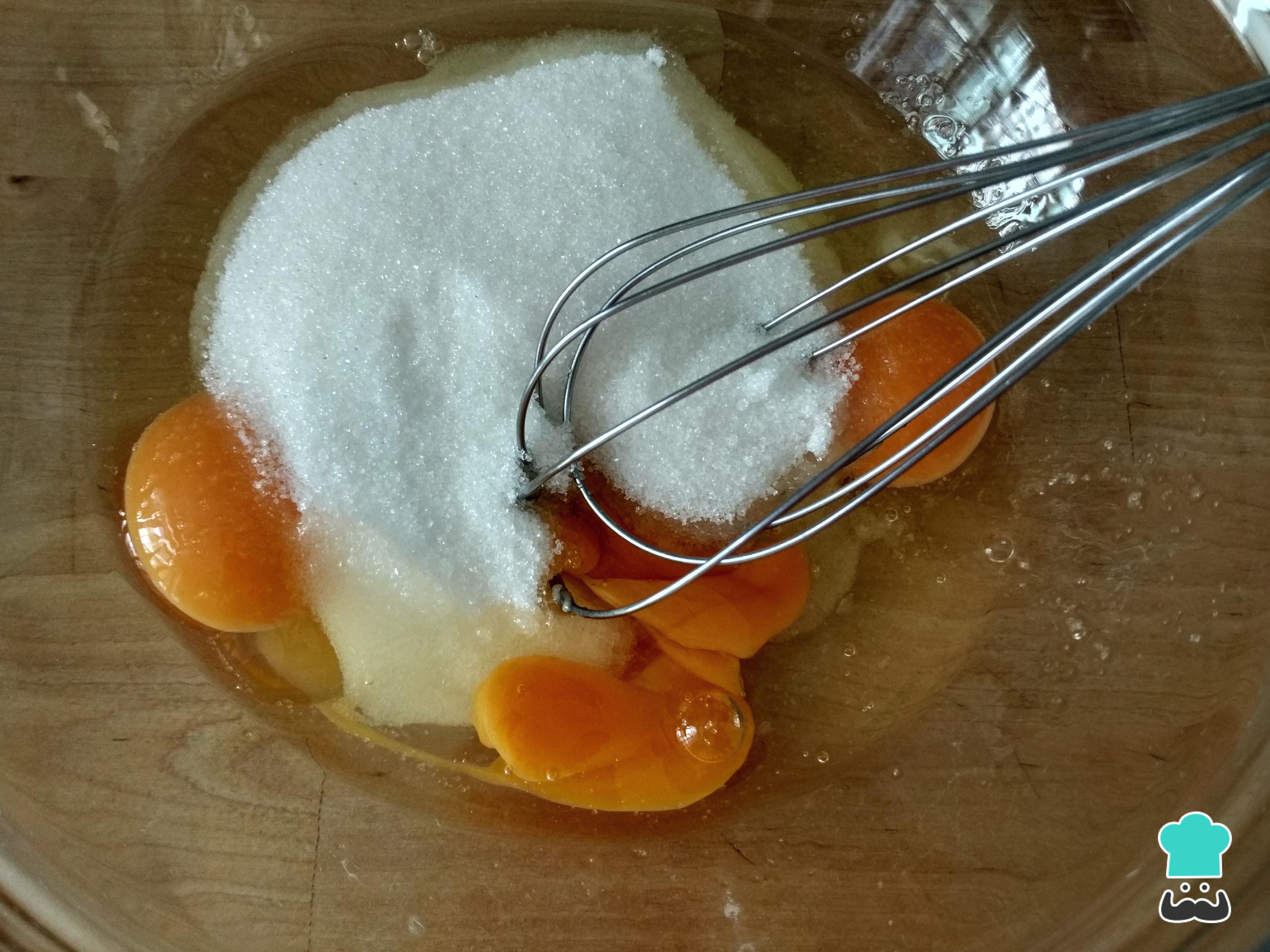 À parte bata os ovos com o açúcar usando um batedor de mão ou batedeira elétrica. Quando obtiver um creme bem suave acrescente o leite vegetal e o óleo em forma de fio, quando bate.