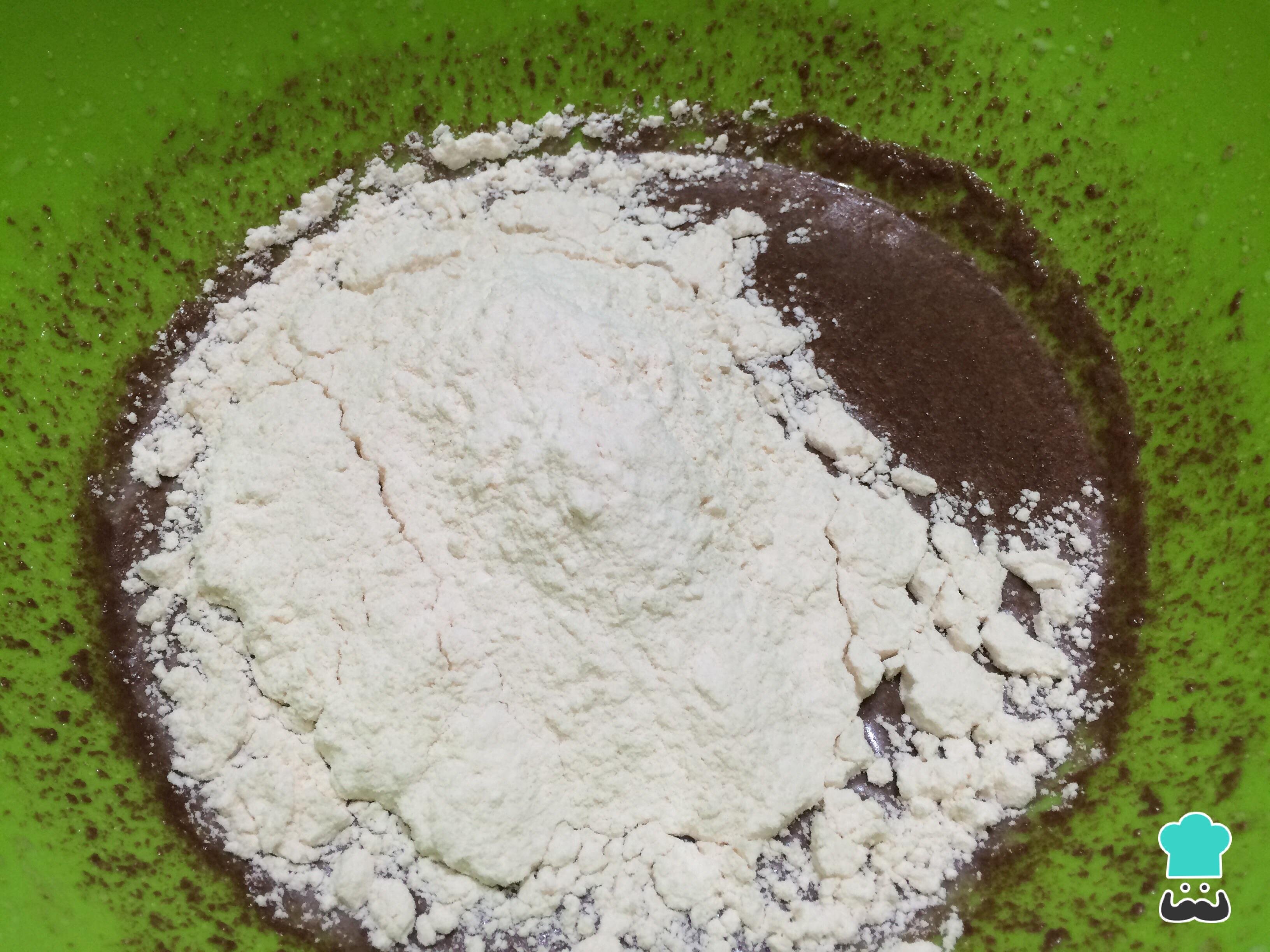 O passo seguinte deste bolo sem ovo é adicionar a farinha e o fermento e misturar até obter uma consistência homogênea.