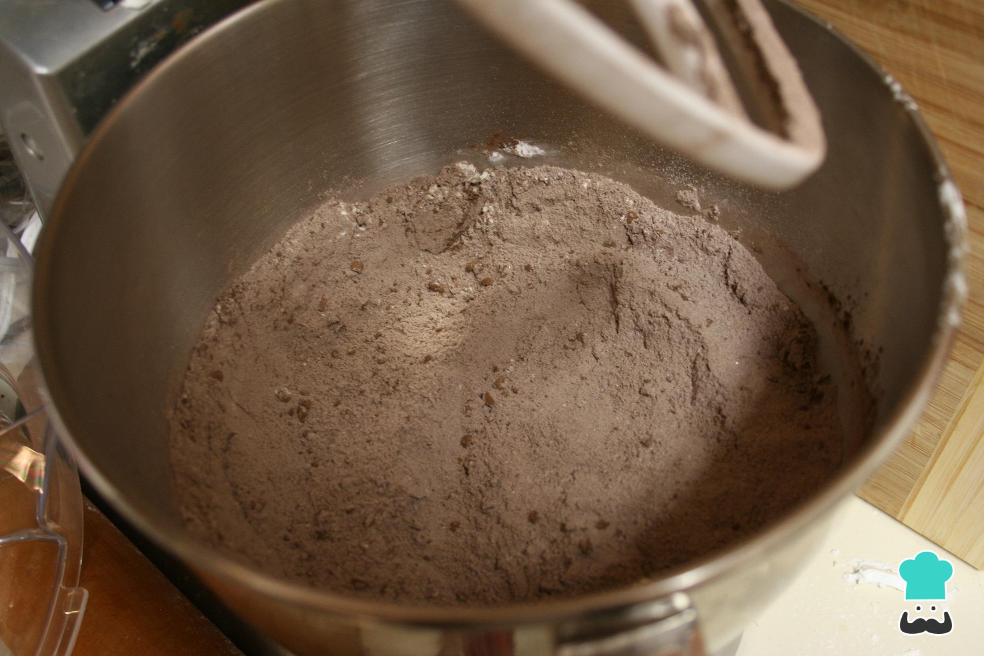 O primeiro passo desta receita de bolo é começar preparando a massa: em uma tigela misture os ingredientes secos (a farinha, o açúcar, o chocolate, o bicarbonato e o sal).