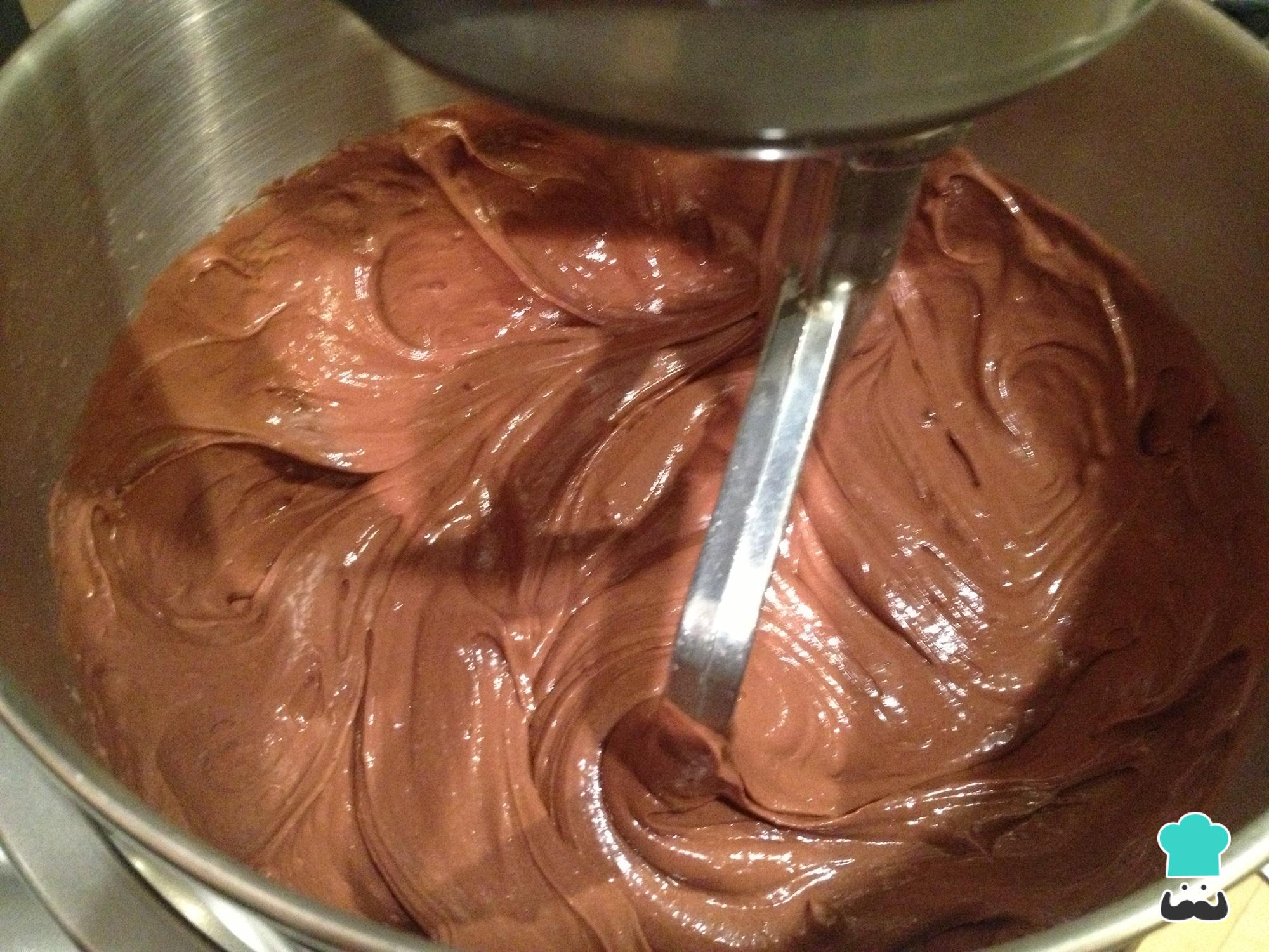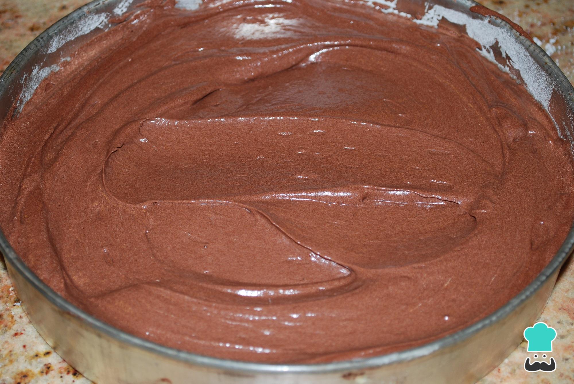 Coloque a massa deste bolo de chocolate numa forma de bolo untada e enfarinhada, e leve a assar no forno preaquecido a 180ºC por cerca de 30 minutos.
