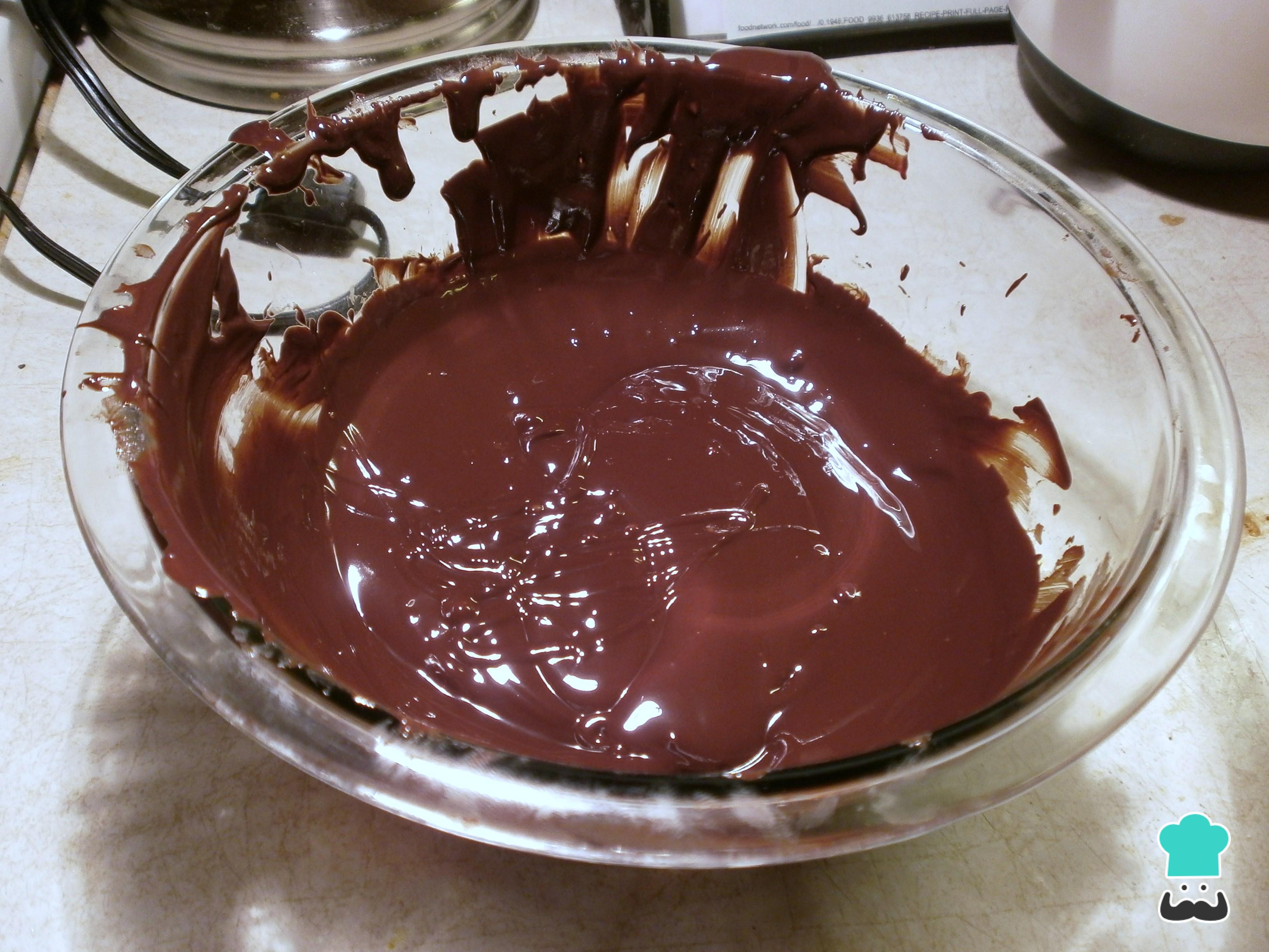 Enquanto isso, prepare a cobertura: pique o chocolate e leve a derreter no microondas, em potência máxima, de 30 em 30 segundos, tirando para mexer. Adicione o leite de coco e misture bem.