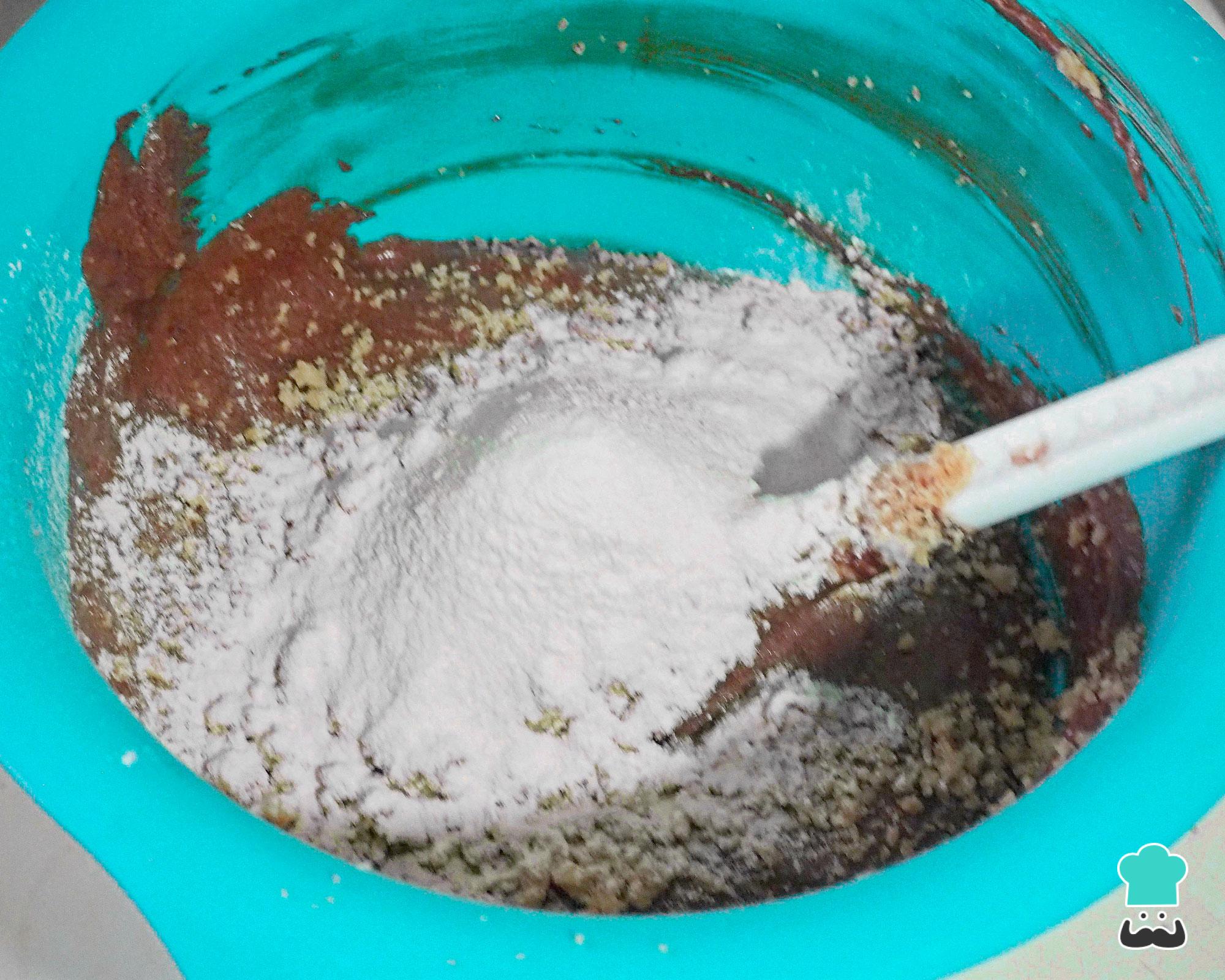Seguidamente, para conferir textura e estrutura neste bolo de chocolate úmido, adicione as nozes picadas e a maizena peneirada junto com o cacau e o bicarbonato de sódio. Misture para incorporar bem.