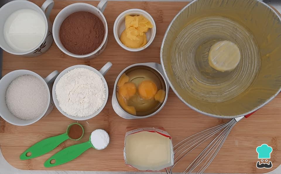 Separe os ingredientes necessários para preparar seu bolo churros de chocolate. Para esta receita, é preciso que unte bastante a forma, pois isso evitará que o doce de leite fique difícil de ser desenformado. Outra coisa importante é que todos os ingredientes estejam em temperatura ambiente, pois isso irá garantir um bolo bem assado.