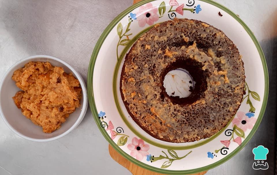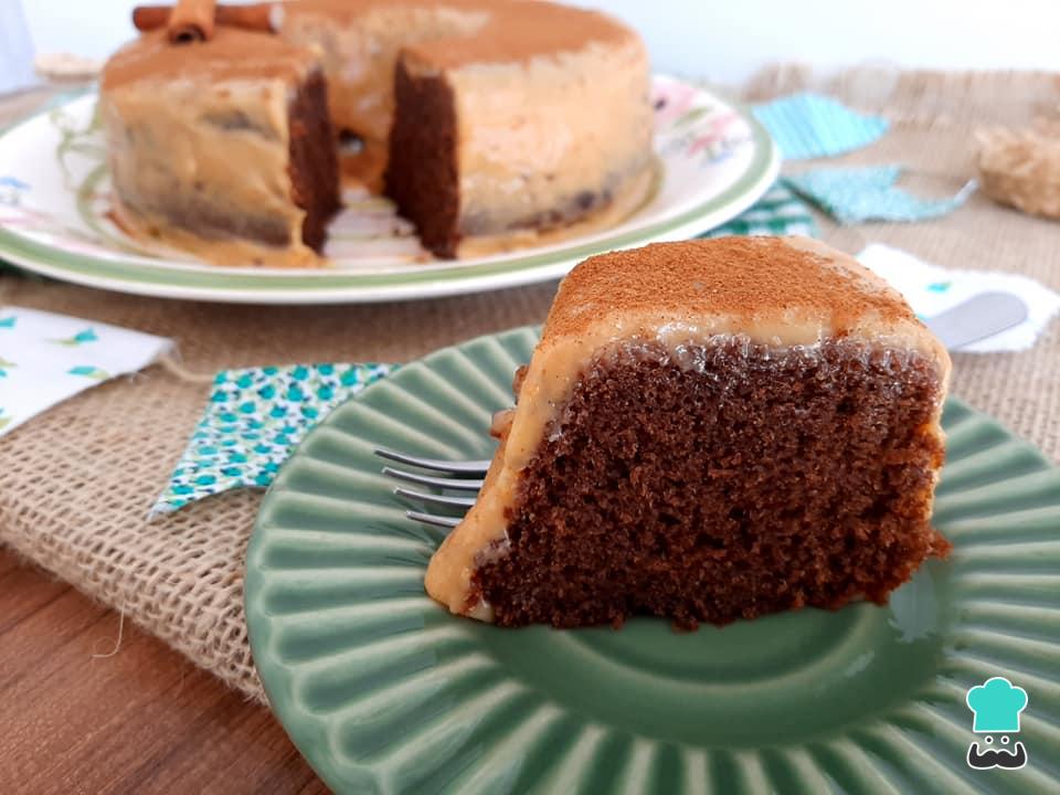 Dica: em hipótese alguma deixe o bolo esfriar para desenformar, pois o doce de leite poderá endurecer na forma e não soltar com facilidade.