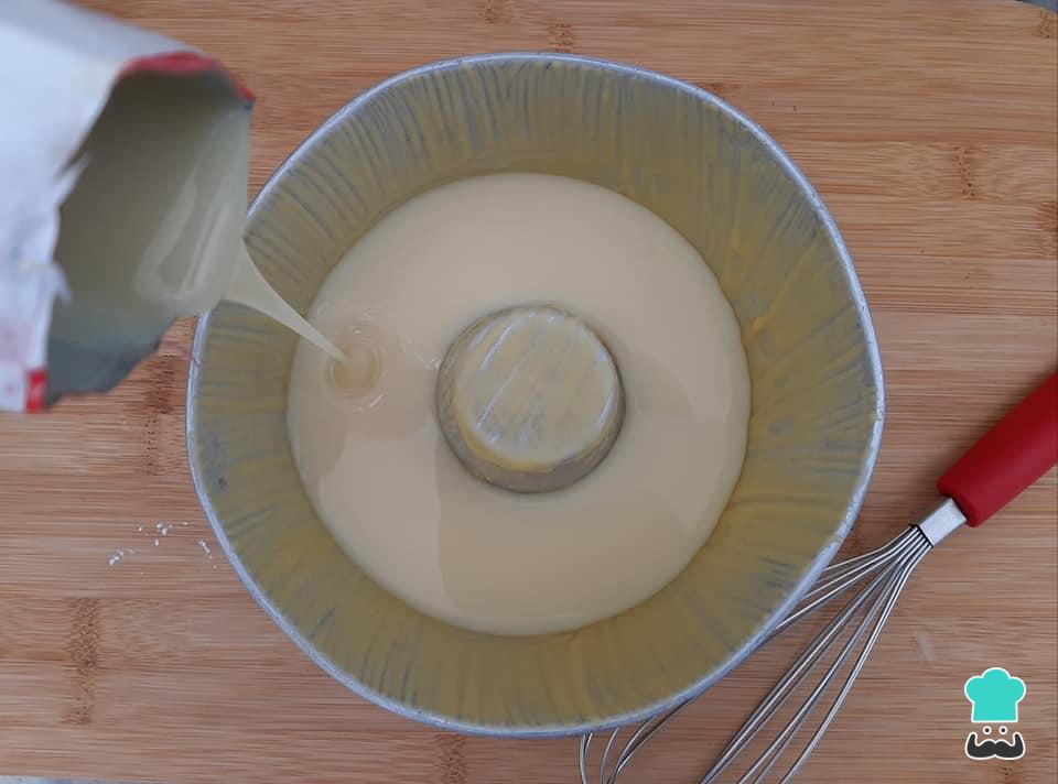 Passe bastante manteiga na forma, especialmente no fundo. Adicione o leite condensado na forma e em seguida, reserve-a dentro da geladeira enquanto prepara a massa do bolo. Esse truque fará com que o leite condensado fique mais firme e, na hora que adicionar a massa do bolo sobre ele, evitará que este suba.