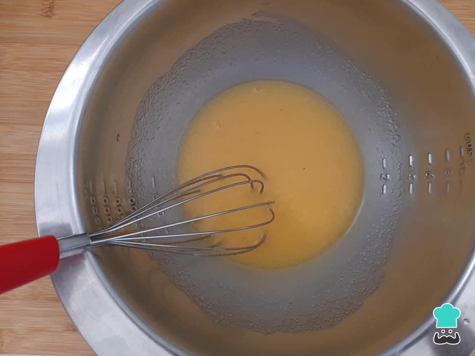 Num bowl misture o açúcar, os ovos e a manteiga com um fouet até formar um creme uniforme.