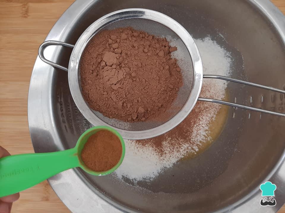 Adicione também o chocolate em pó peneirado e a canela em pó.