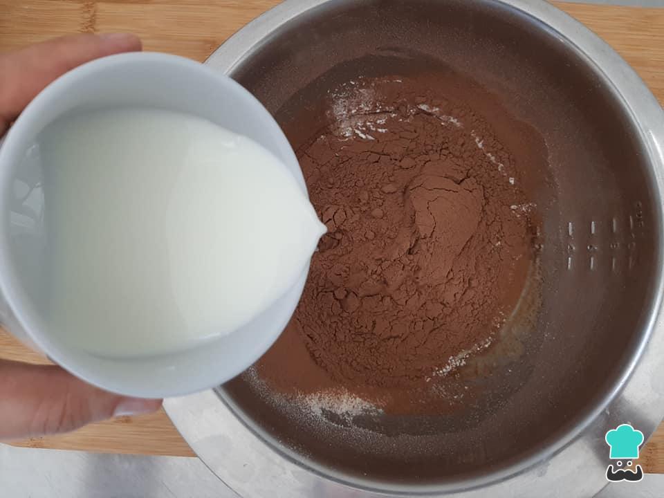 Adicione o leite e misture tudo com um fouet até a massa ficar lisa e homogênea.