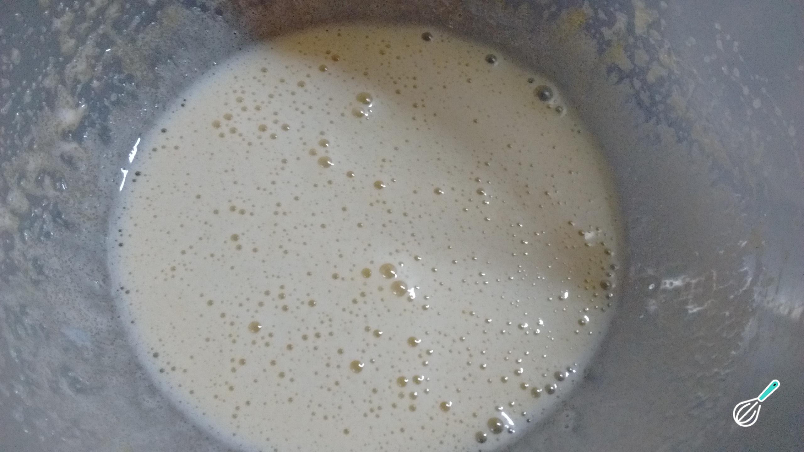 Coloque o ovo, a essência de baunilha e o açúcar em uma tigela, bata até ficar esbranquiçado (ou seja, quando a mistura ficar com uma cor amarela bem clara como na foto).