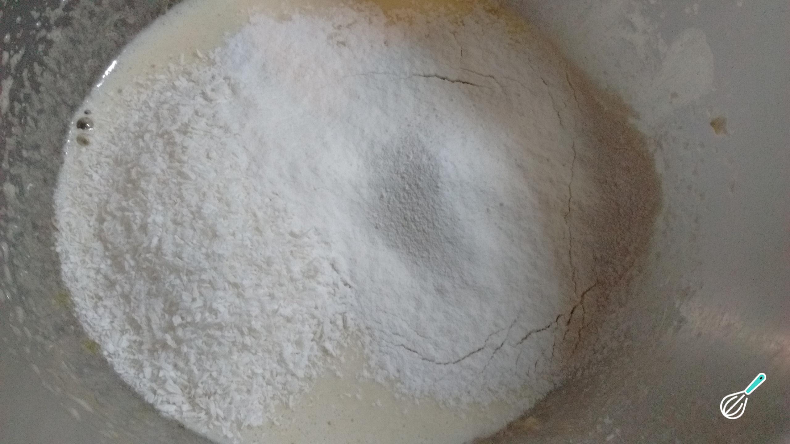 Junte o coco ralado, o leite e metade da farinha peneirada junto com o fermento e o bicarbonato de sódio. Misture com uma espátula fazendo movimentos delicados. Em seguida, acrescente o restante da farinha e misture da mesma forma.