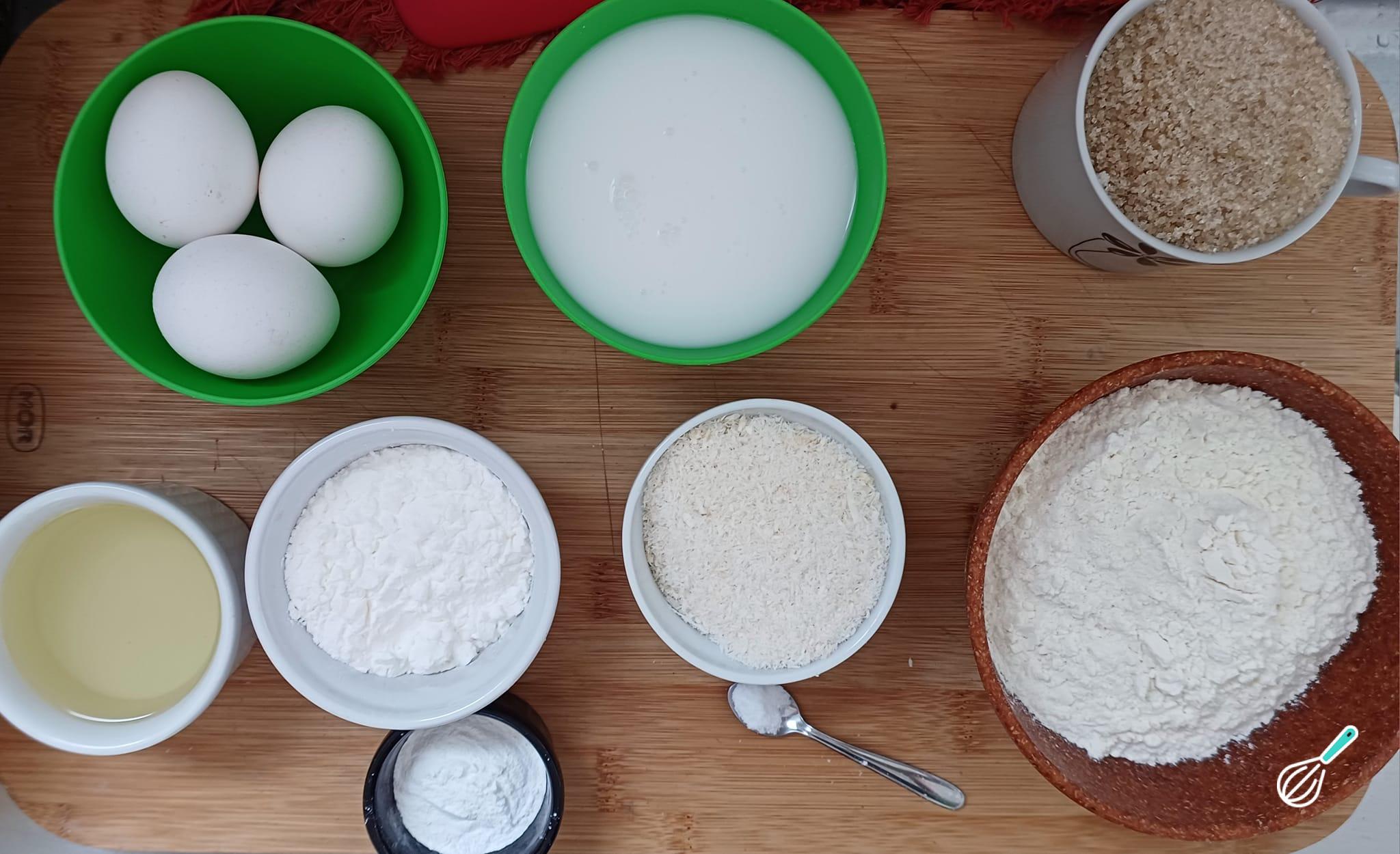 Separe os ingredientes necessários para preparar a receita de bolo de coco de liquidificador.