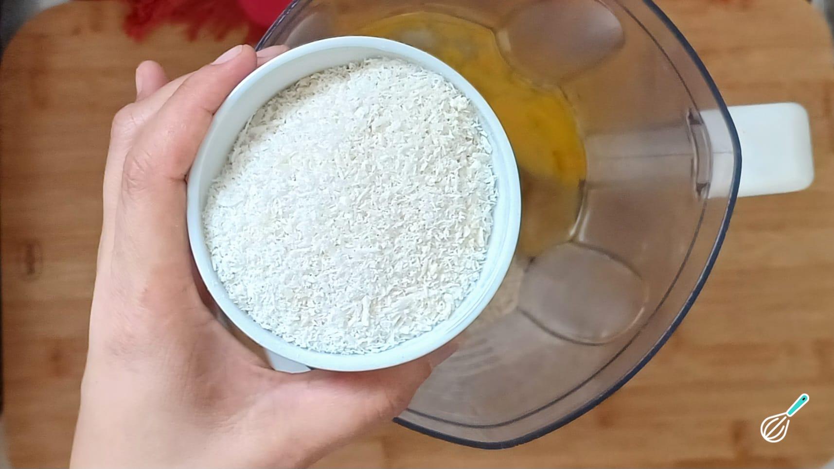 No liquidificador, coloque os ovos, o açúcar, o óleo e o coco ralado.