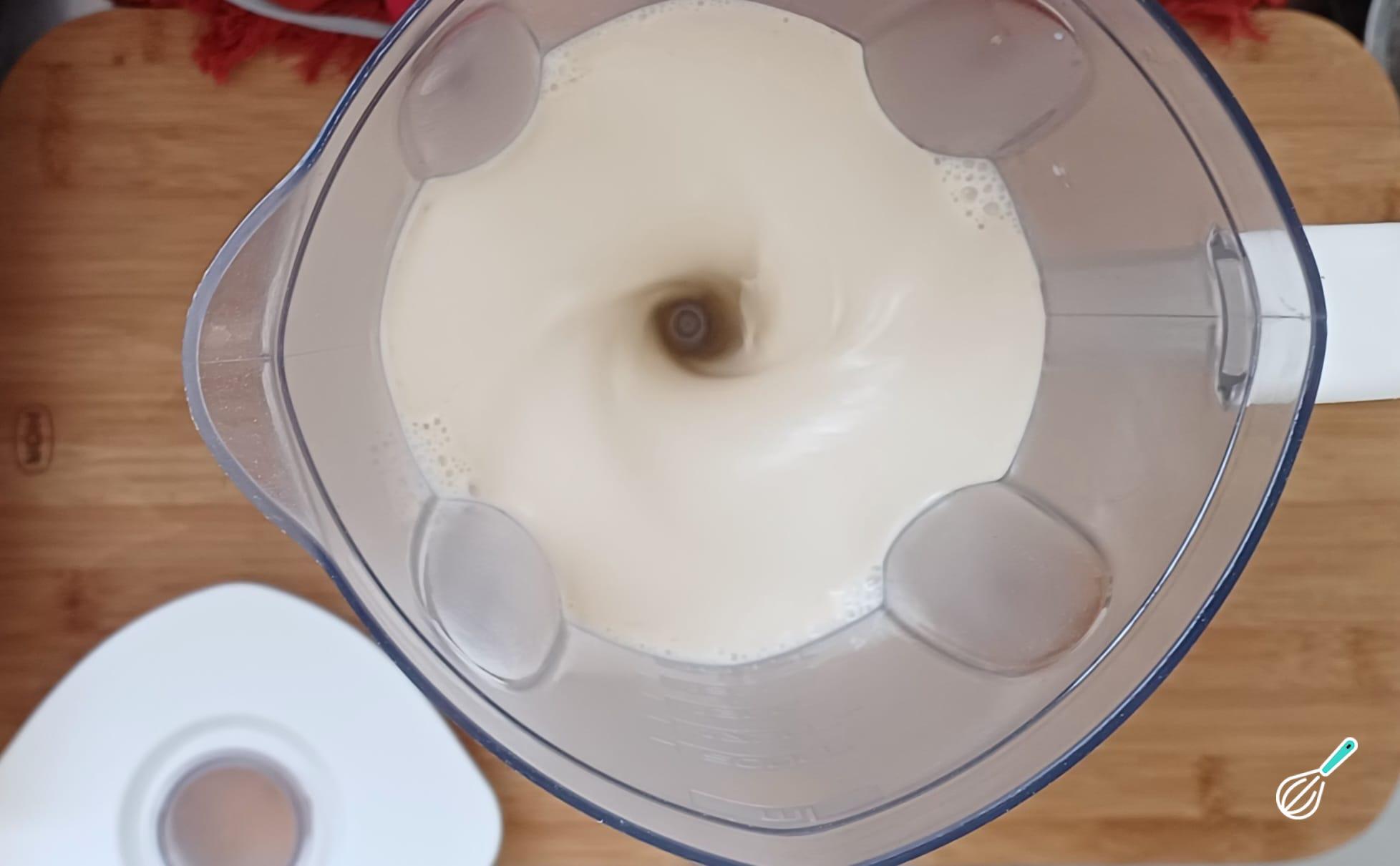 Em seguida, acrescente a pitada de sal e o leite de coco e bata por alguns minutos até ficar homogêneo.
