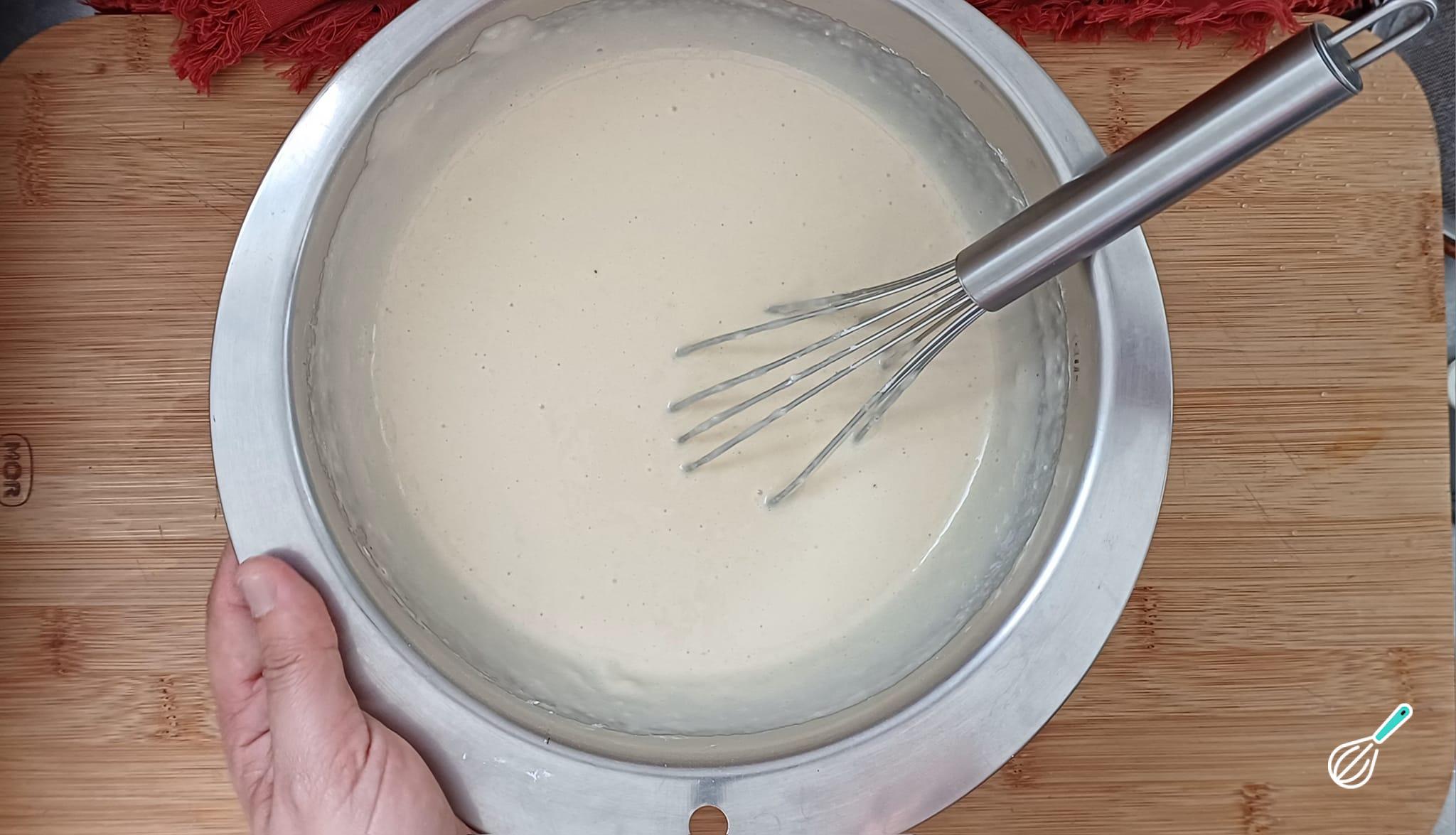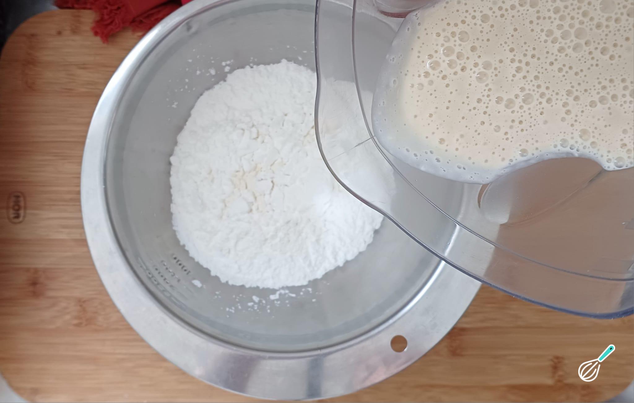 Transfira essa mistura para um bowl, misturando com a farinha de trigo peneirada.