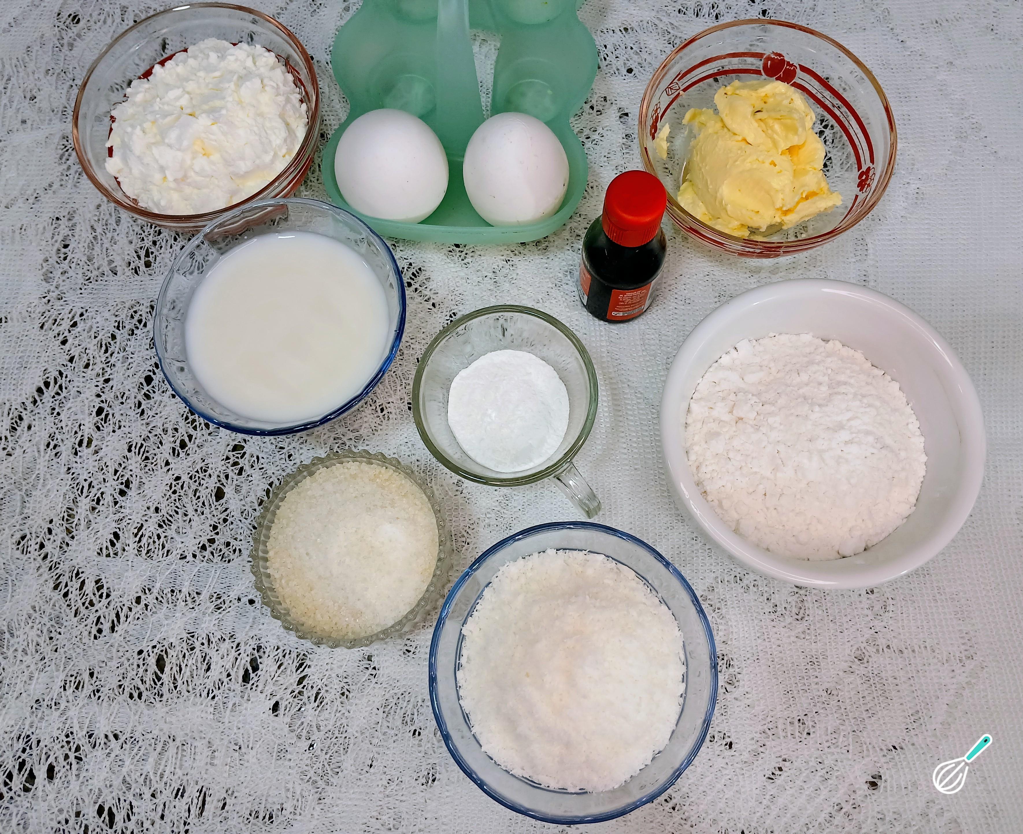 Comece separando os ingredientes para o preparo do bolo de coco sem lactose. Separe os ovos, o coco ralado fino e adoçado, separe a farinha de arroz e o amido de milho. Separe o leite de coco, a margarina vegetal, a essência de baunilha e o fermento.