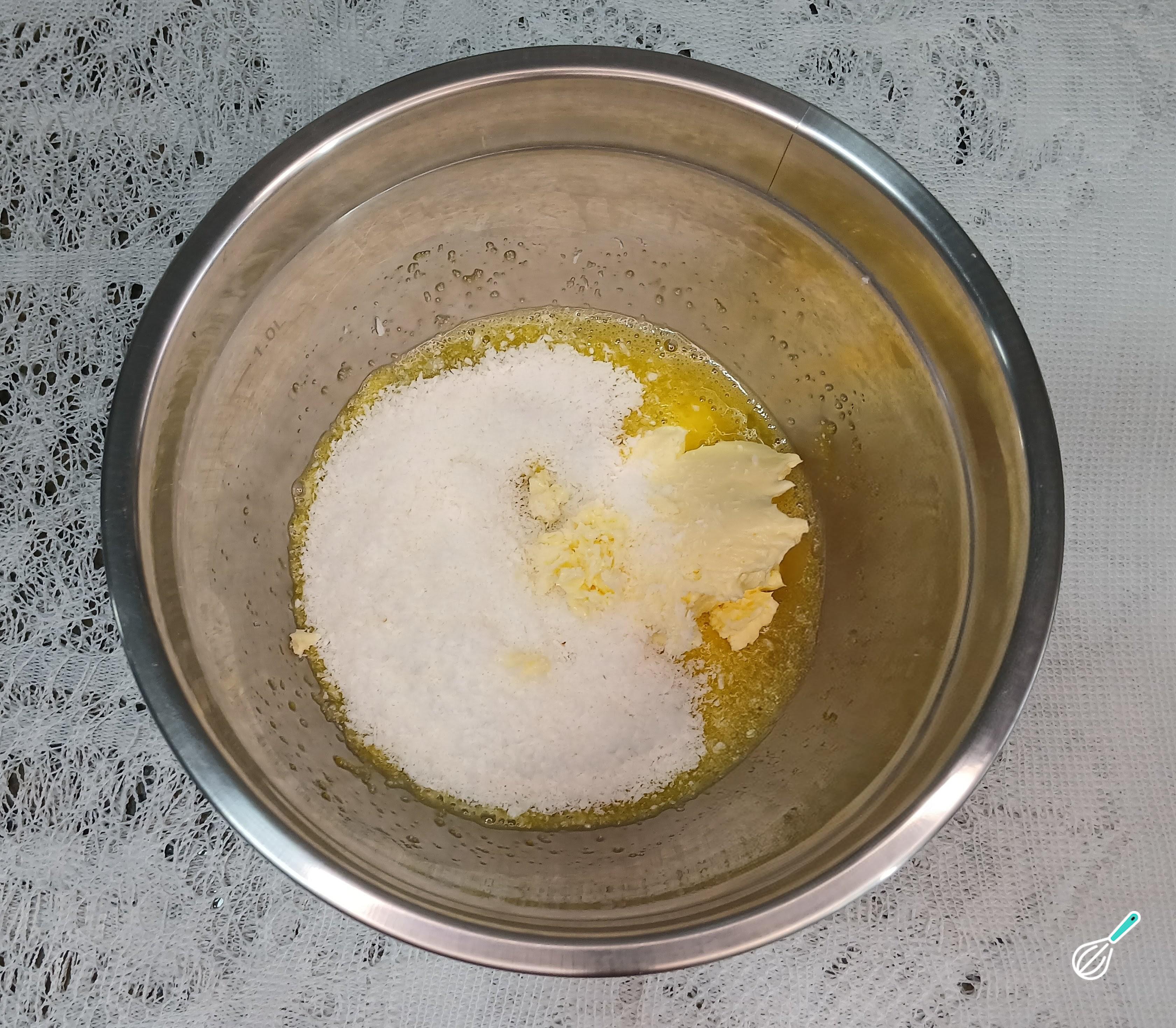 Depois de separados os ingredientes, em um bowl, coloque os ovos, o açúcar e a essência de baunilha. Com a ajuda de um fouet mexa bem para que fique tudo bem homogêneo.