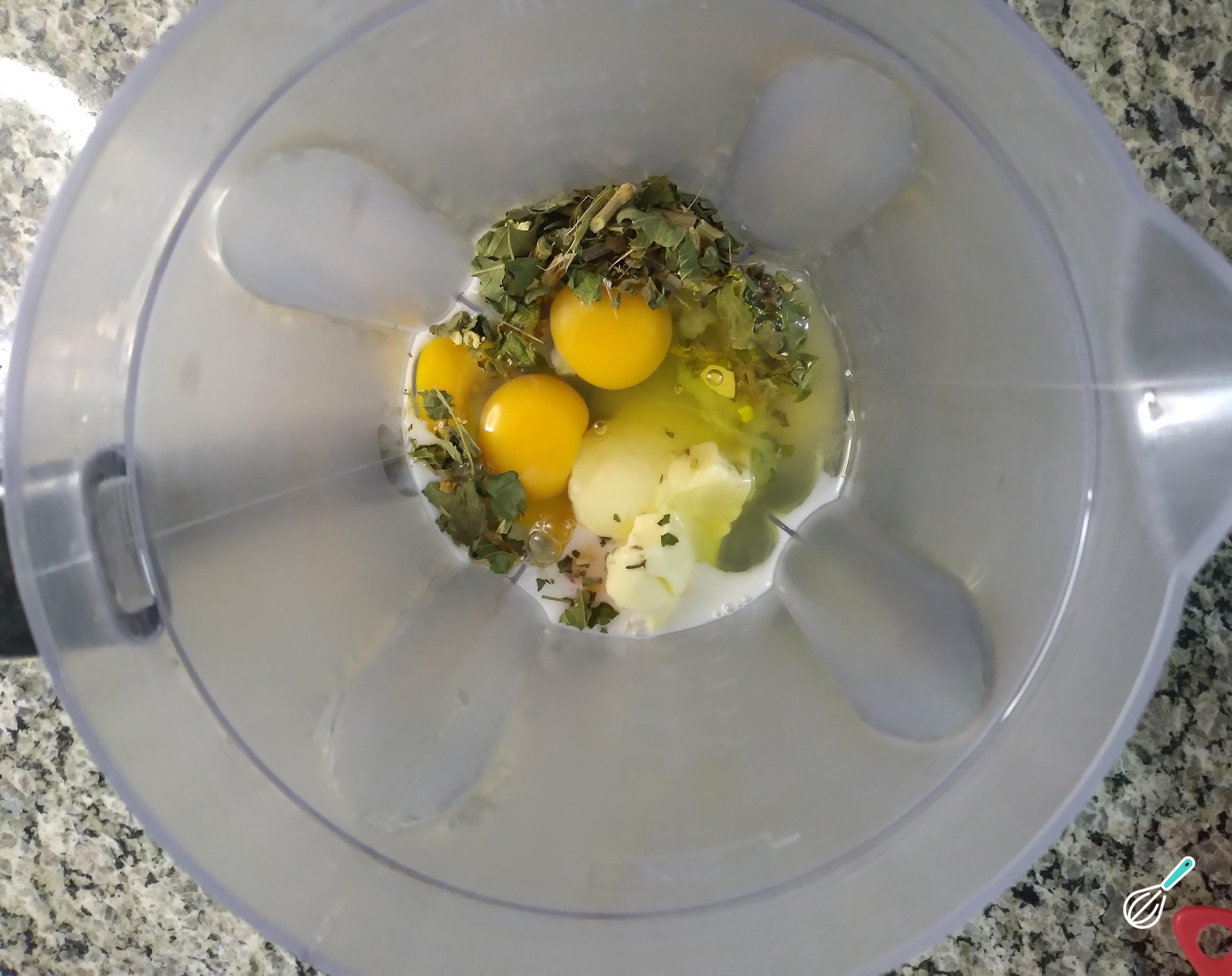 No liquidificador, coloque os ovos, o açúcar, o leite, a erva cidreira e a manteiga. Bata até ficar homogêneo.