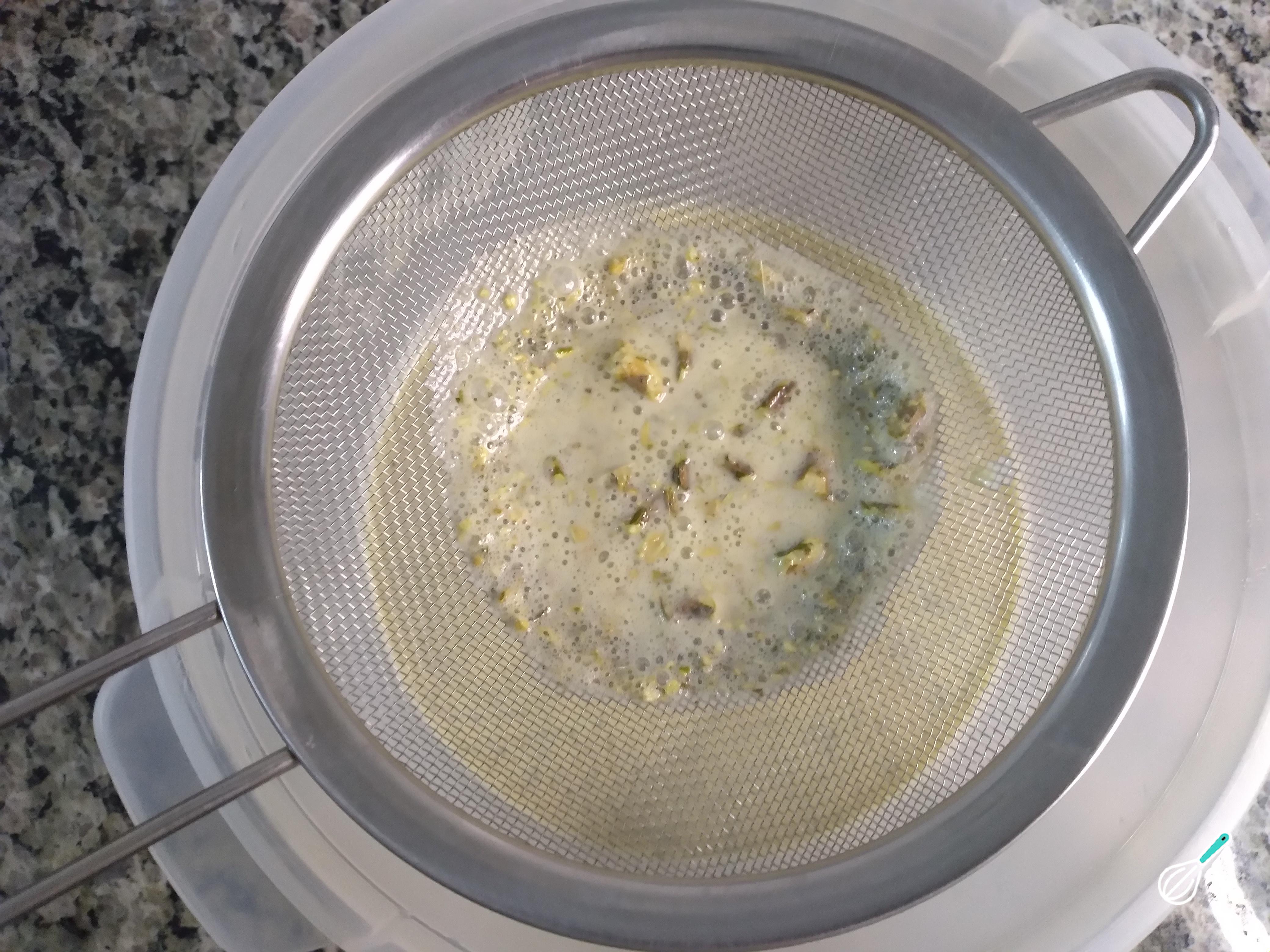 Em seguida coe o conteúdo do liquidificador para que a erva cidreira fique no bolo e comprometa a textura.