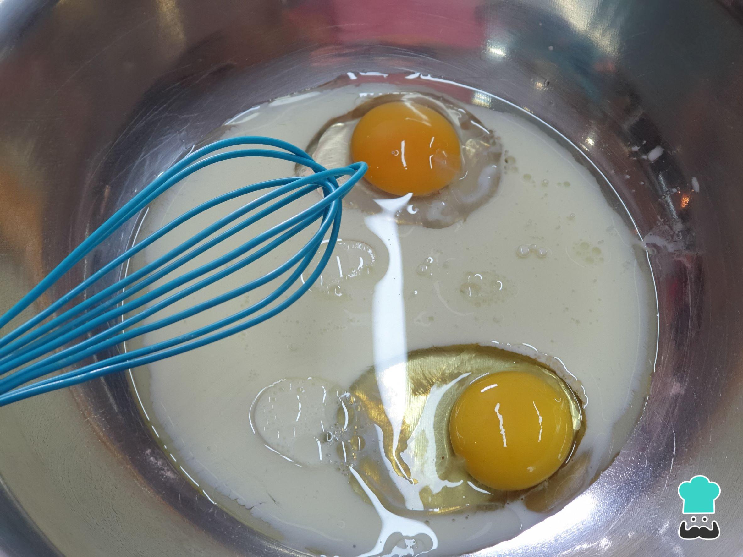 Em um bowl misture o leite, o óleo e os ovos e bata apenas para incorporar tudo, com a ajuda de um fouet.