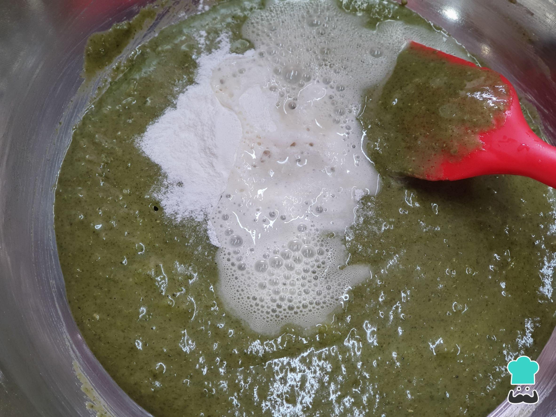 Por fim, adicione o vinagre, o fermento e o bicarbonato e incorpore delicadamente.