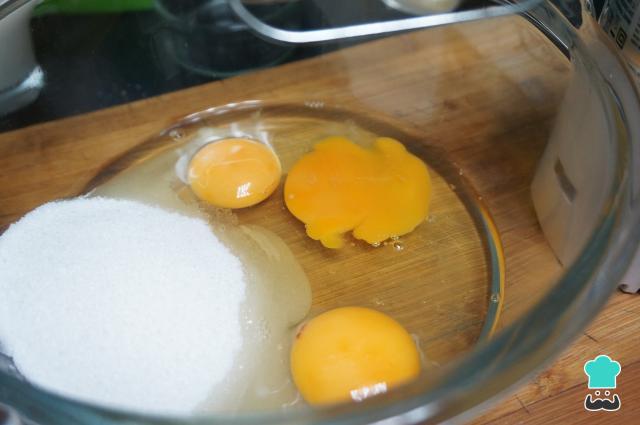 Pré-aqueça o forno a 180ºC com o calor em cima e em baixo. Bata os ovos com o açúcar, de preferência usando um batedor elétrico ou no liquidificador, até obter um creme bem suave.