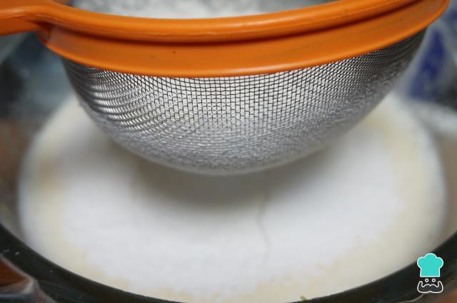 Numa outra tigela misture a farinha, a maizena e o fermento. Adicione na massa anterior, usando uma peneira, para conseguir um bolo mais macio e fofo, sem grumos.