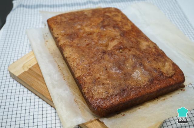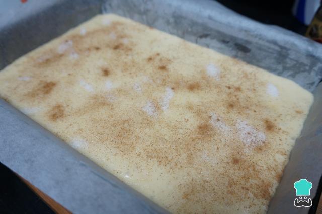 Coloque a massa na forma e, se quiser, polvilhe 1-2 colheres de sopa de açúcar refinado e 1 colher de sopa de canela moída por toda a superfície da massa. Leve para assar no forno a 180ºC durante 30 minutos.