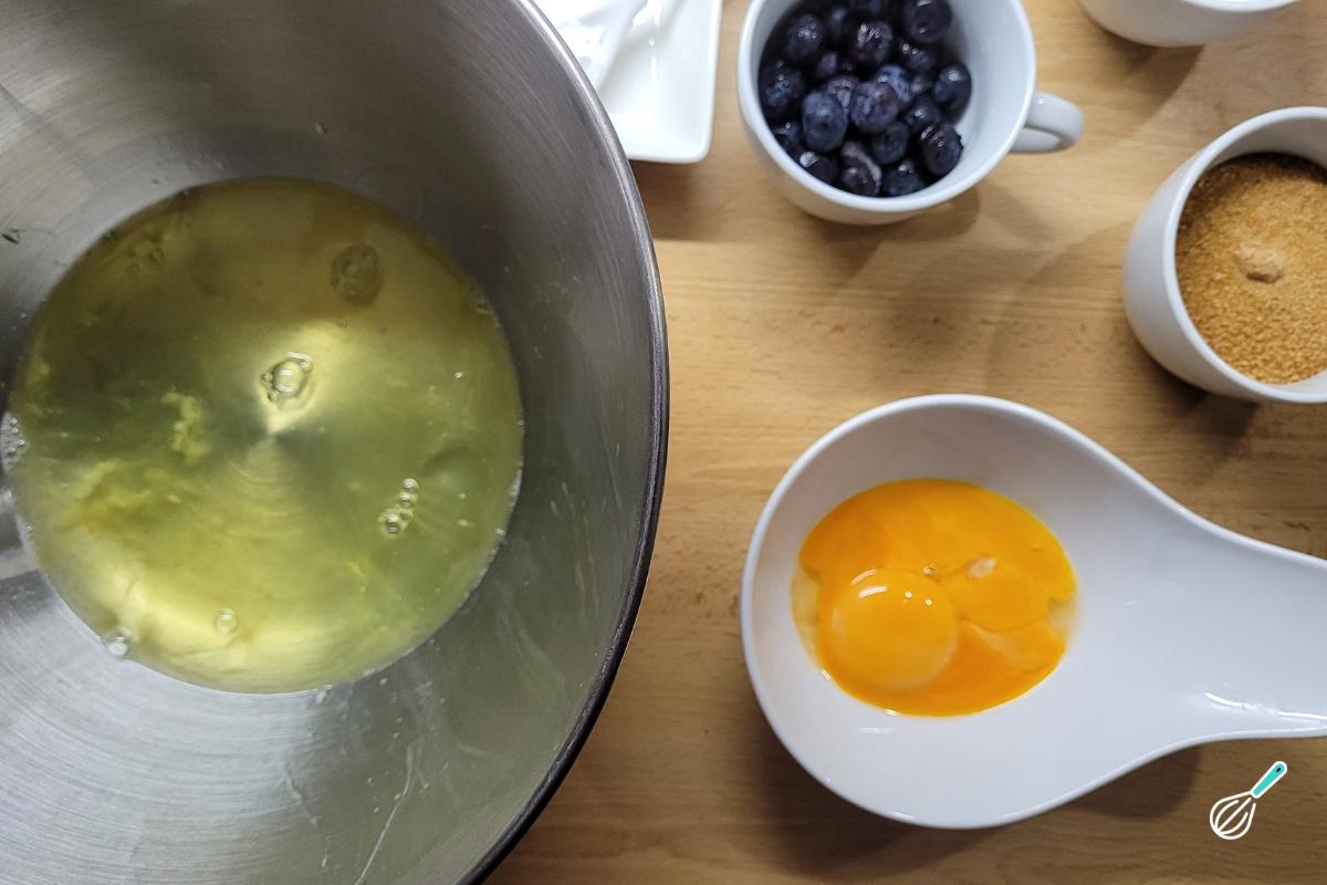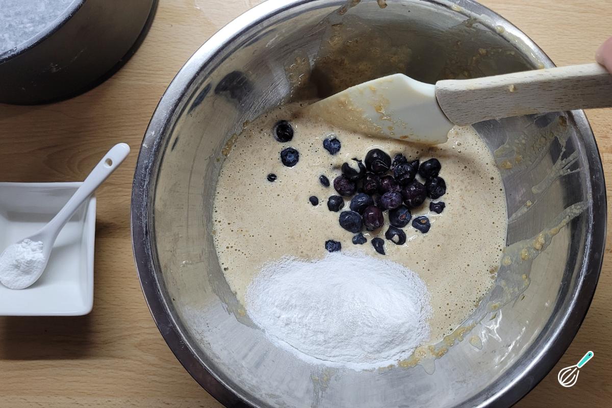 Junte os mirtilos e a farinha de arroz e misture. Deixe o fermento para adicionar no final.