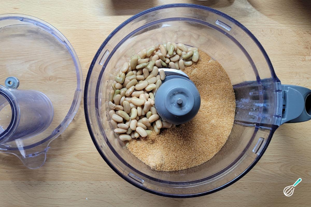 Coloque o feijão cozido com o açúcar em um processador e bata até obter uma pasta bem cremosa e sem gruminhos. Se for necessário, abra o processador e vá raspando as laterais com uma espátula. Você pode usar o liquidificador, mas precisará ter mais paciência e ir abrindo e raspando as laterais para ajudar a bater.