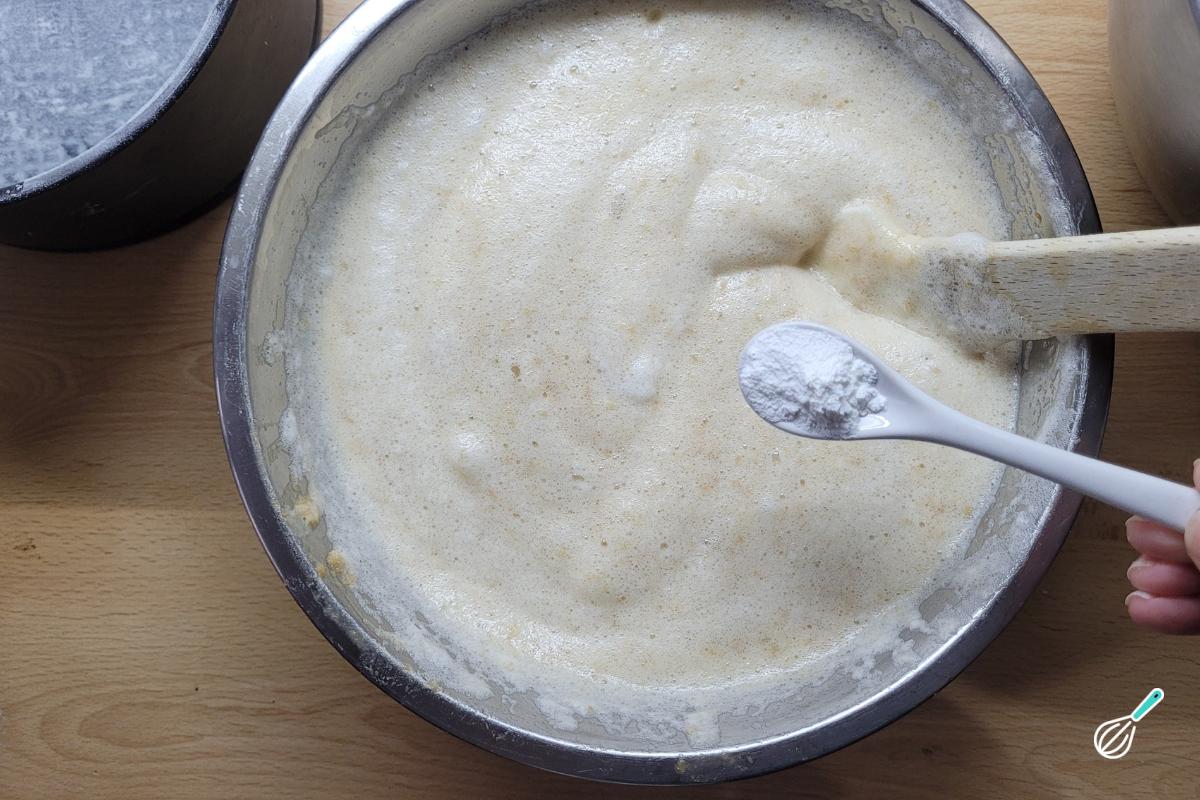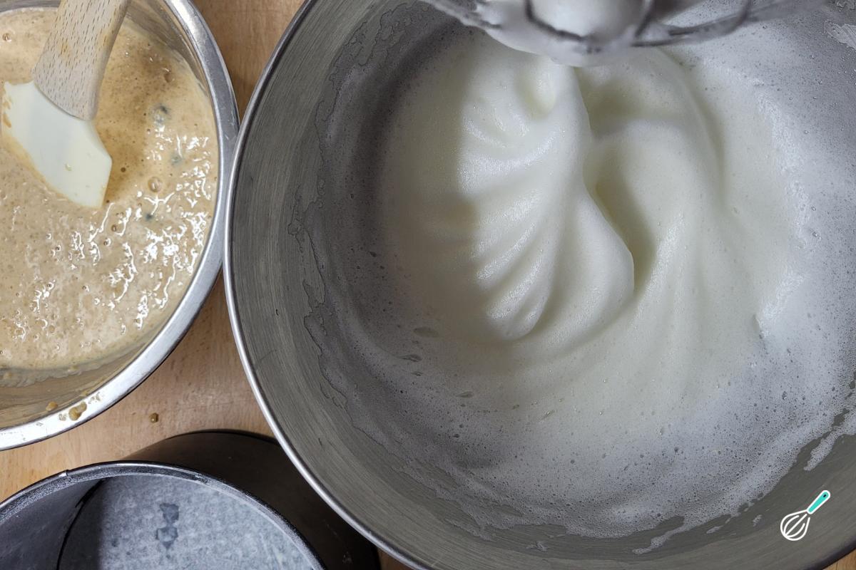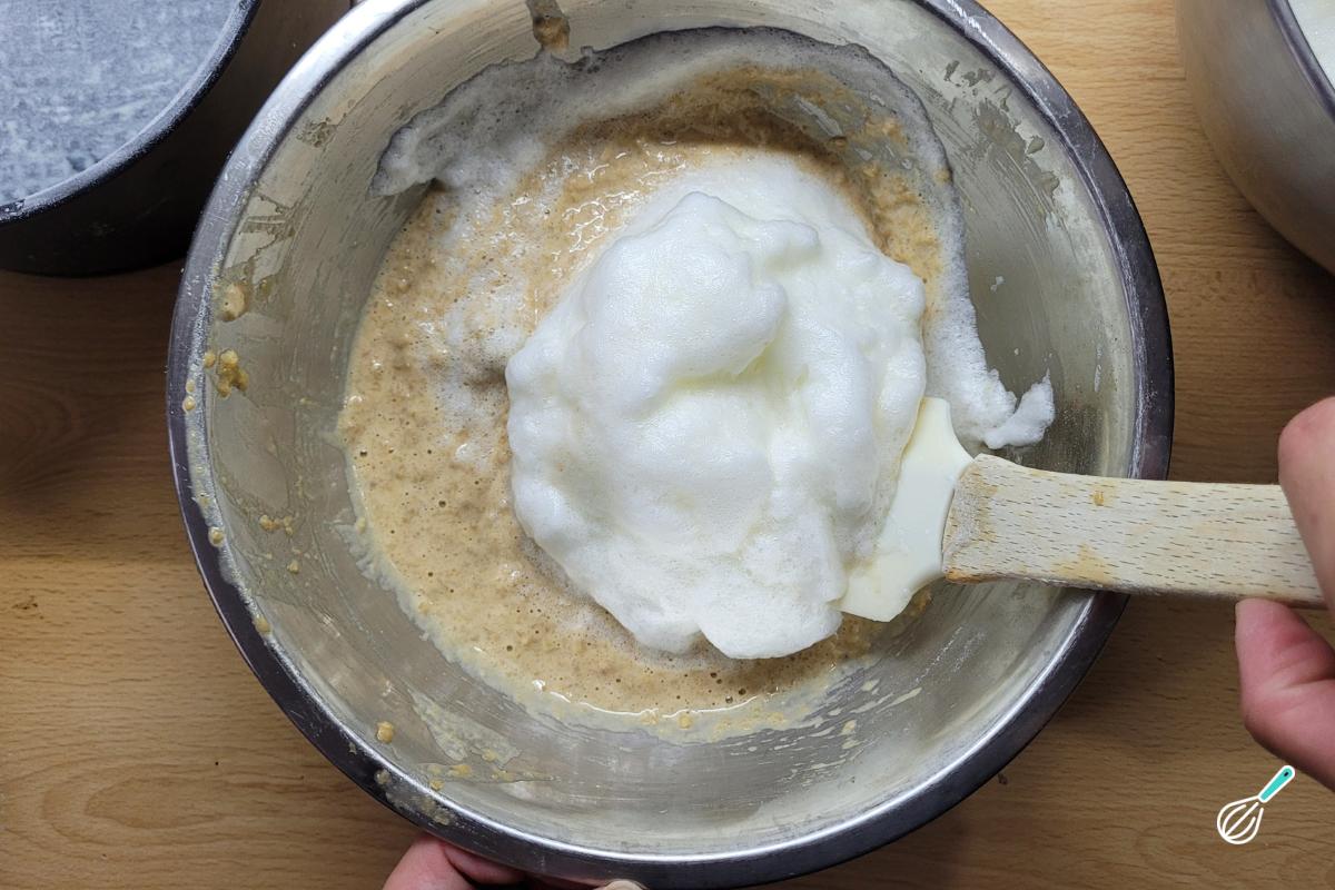 Misture as claras em neve aos poucos de incorporando de baixo para cima delicadamente com uma espátula para não perder a aeração.