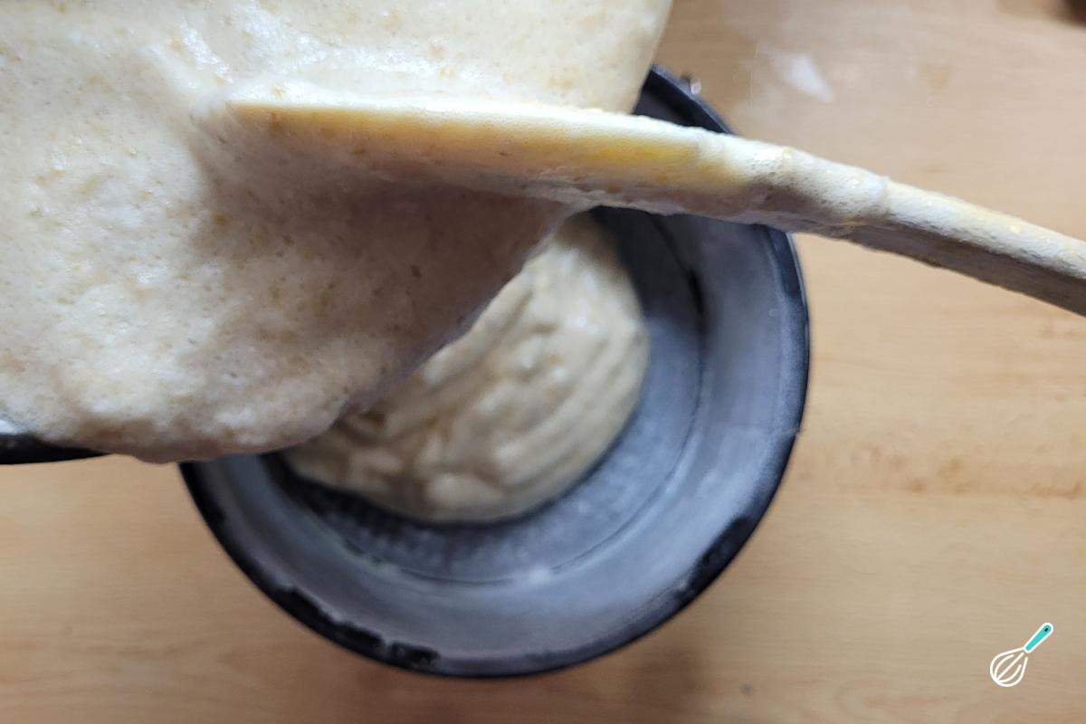 Coloque a massa em uma forma untada e polvilhada com farinha de arroz e leve ao forno pré-aquecido a 180oC por 40 minutos ou até que o bolo esteja assado (faça o teste com uma faca ou palito para conferir).