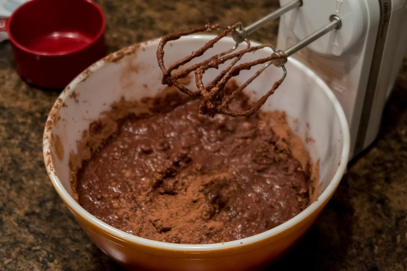 Prepare a massa do bolo junino de chocolate batendo os ovos com o açúcar até virar um creme (este passo é importante para o bolo ficar fofinho). Acrescente os restantes ingredientes, deixando o fermento para último, e bata com a batedeira até misturar tudo muito bem.