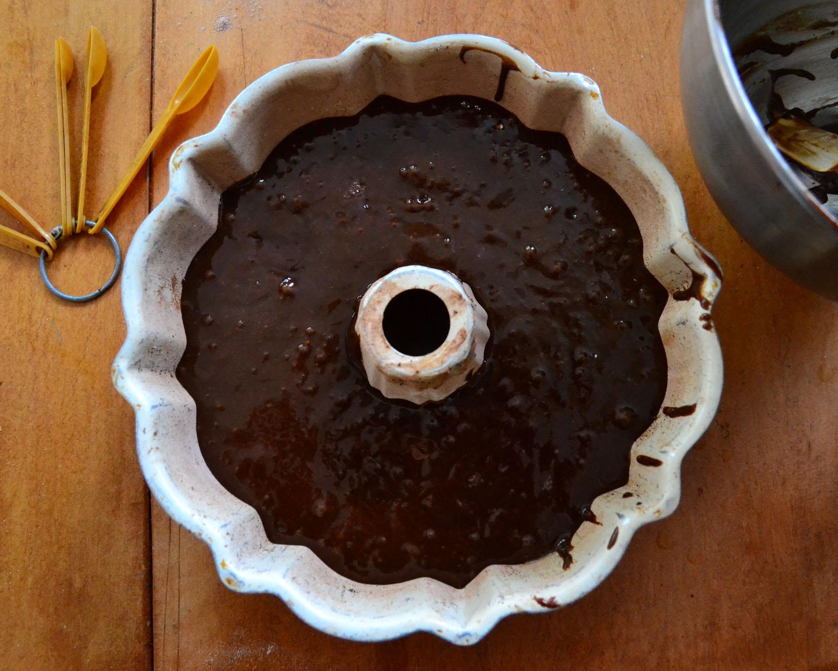 Coloque a massa do bolo numa forma untada e enfarinhada (pode ser com ou sem furo central) e coloque no forno preaquecido a 180ºC. Asse por 40-45 minutos ou até passar no teste do palito.