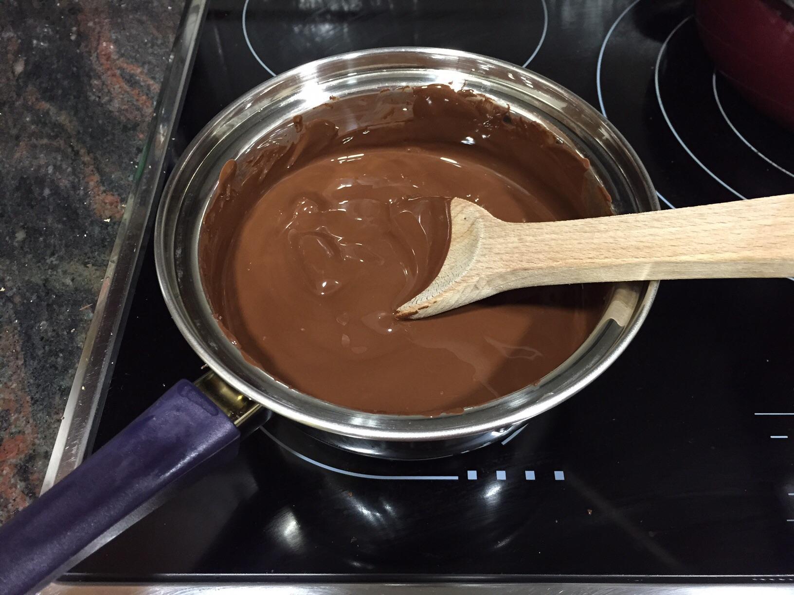 Enquanto isso prepare a cobertura colocando numa panela o tablete de chocolate picado e o creme de leite. Leve ao fogo baixo mexendo até o chocolate derreter completamente e virar uma calda cremosa. Acrescente a manteiga, misture até incorporar, desligue o fogo e deixe esfriar.