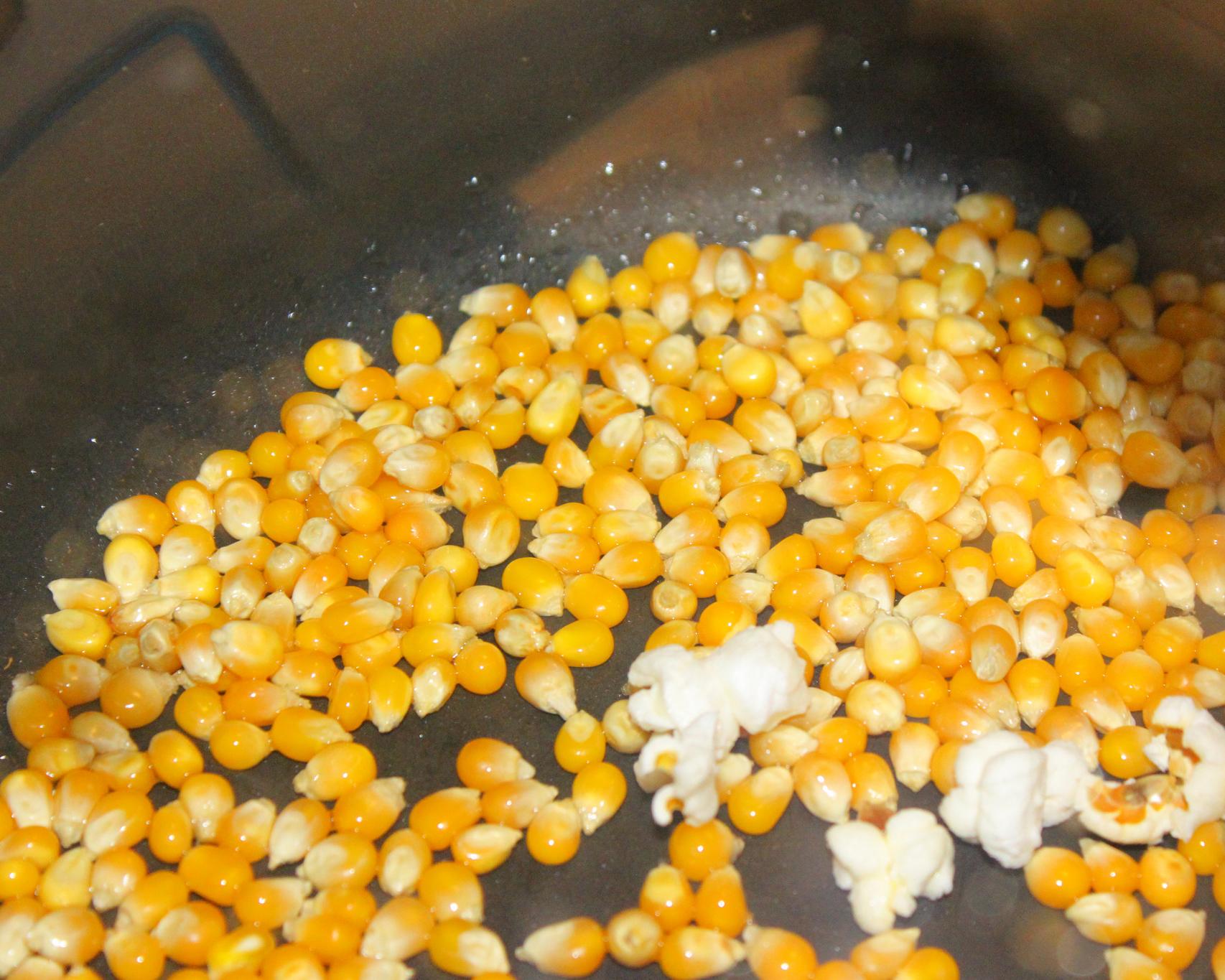 Para fazer a pipoca coloque o óleo e o milho numa panela grande. Tampe e deixe no fogo baixo até o milho estourar todo. Numa panela à parte coloque o açúcar e, em fogo baixo, deixe derreter sem mexer. Quando todo o milho tiver estourado, adicione ao caramelo e misture. Retire para um tabuleiro e deixe esfriar.