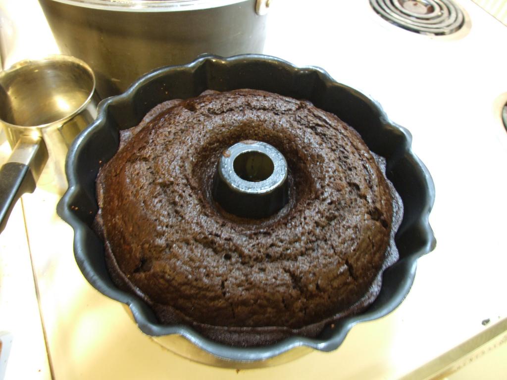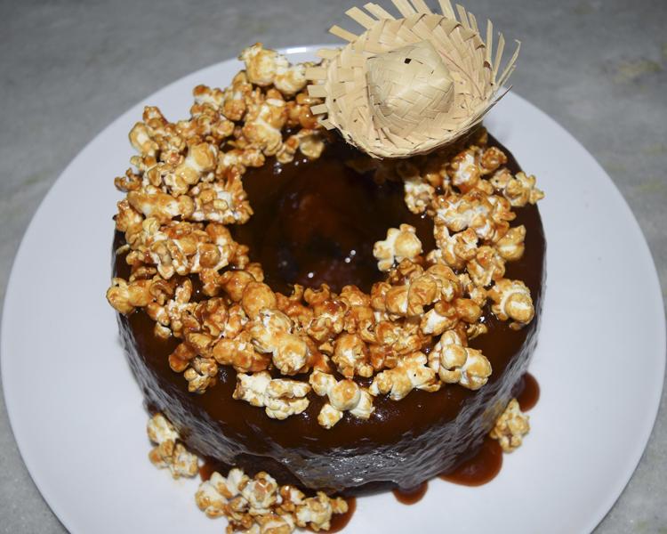 Quando o bolo de chocolate de festa junina estiver assado, retire do forno e deixe esfriar um pouco antes de desenformar. Depois desenforme, coloque num prato e jogue a calda de chocolate sobre ele. Deixe esfriar por completo antes de decorar com as pipocas, ou elas ficarão moles.