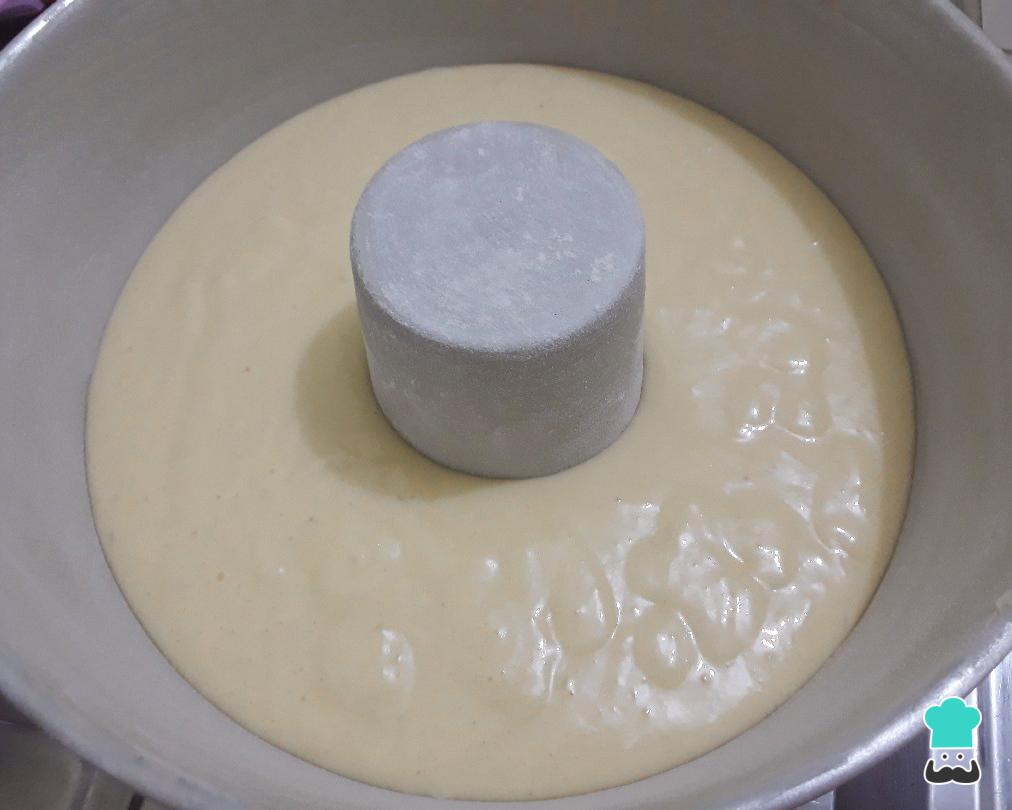 Coloque a massa de bolo numa forma untada com manteiga e polvilhada com maisena. Leve para assar a 200ºC por 35-40 minutos ou até passar no teste do palito.